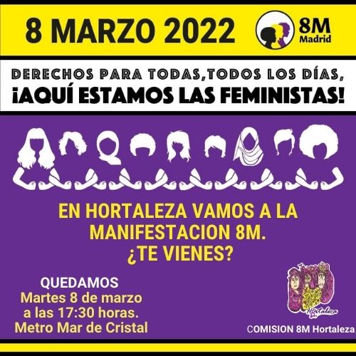 El martes 8 de marzo, Día Internacional de la Mujer, nos encontraremos en el metro de Mar de Cristal a las 17.30 horas para ir juntas a la manifestación que tendrá lugar de Atocha a Colón a partir de las 19.00 horas.
