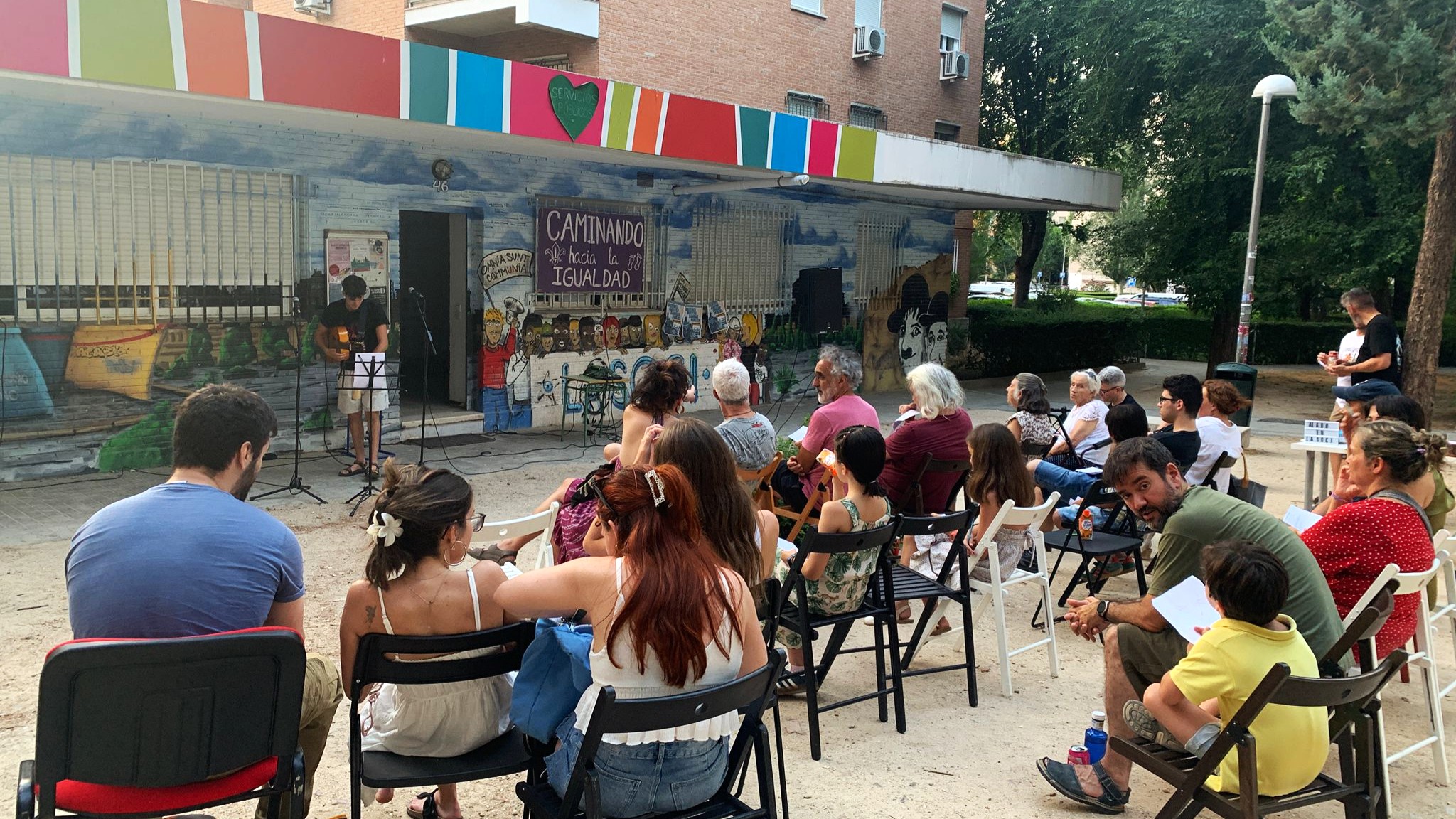 La actuación en directo fue sencilla, cercana, y conmovedora. Miguel interpretó “Cuéntame” junto a otras canciones propias, en un ambiente de complicidad con el público, muchas de ellas vecinas y amigas que han visto crecer al artista y que se sintieron reflejadas en sus palabras. El coloquio posterior sobre la historia del barrio a través de las generaciones aportó un valioso contexto al proyecto y generó un intercambio de recuerdos y vivencias intergeneracionales.
