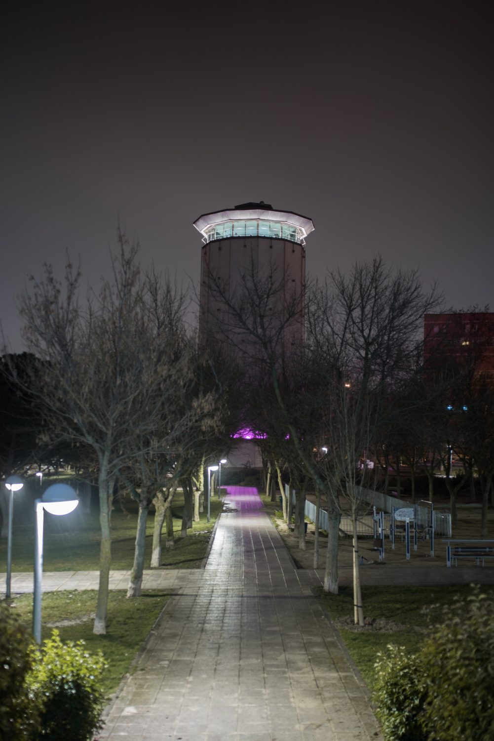 El Silo de Hortaleza, emblema del distrito, lució durante las noches del miércoles y el jueves iluminado de morado por el Día de la Mujer.