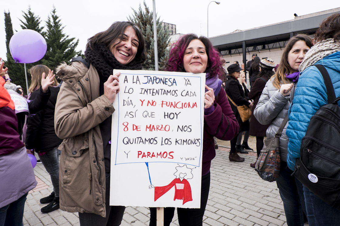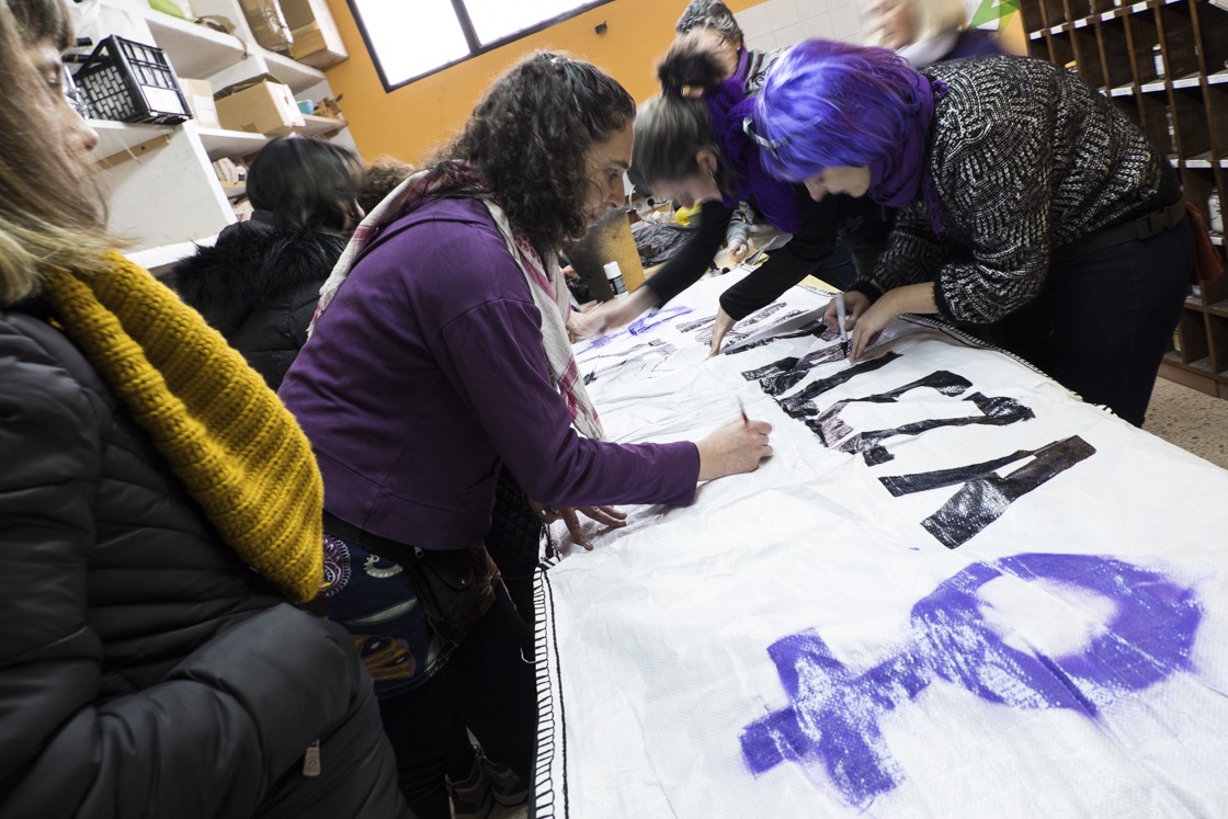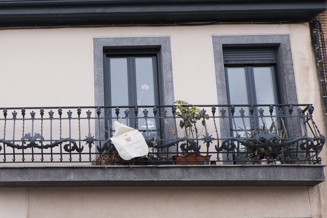 Mientras en el local de La Unión de Hortaleza se pintaba la pancarta protagonista de la jornada, en ventanas y terrazas se exhibían delantales como símbolo de la huelga de cuidados.