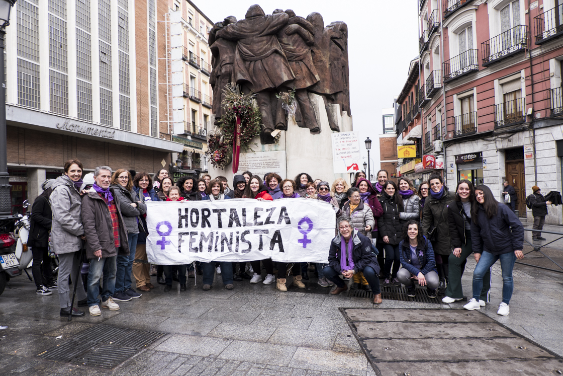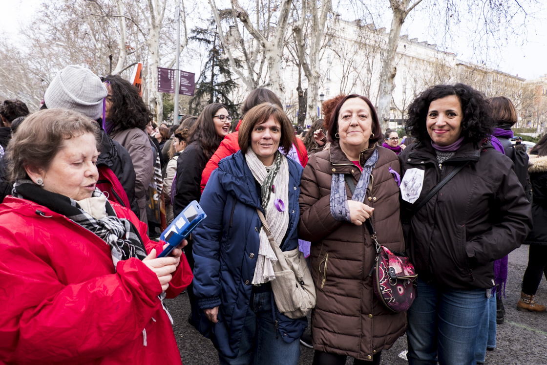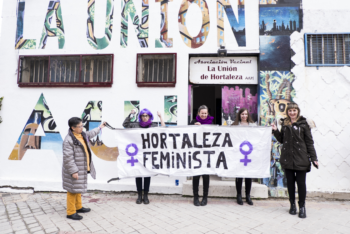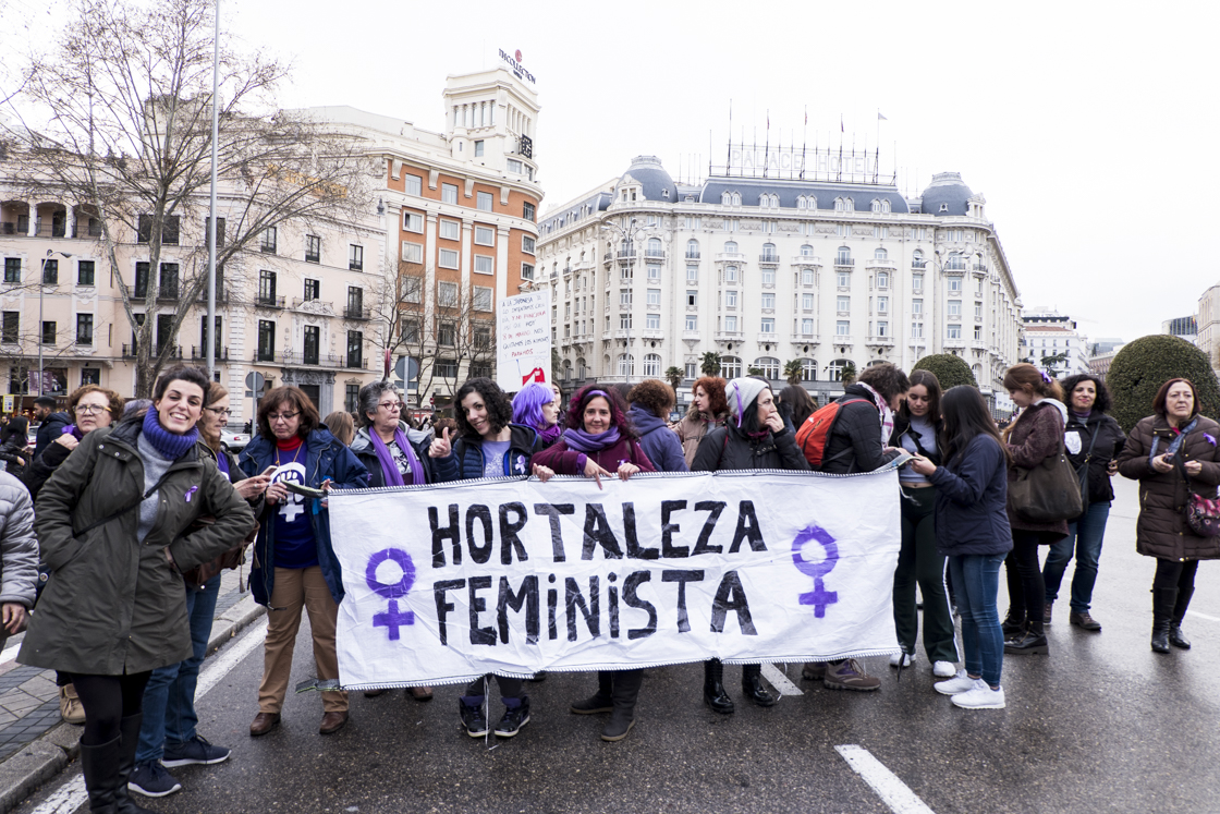 Agrupadas en torno a la pancarta ‘Hortaleza feminista’, mujeres del barrio fueron y recorrieron juntas la masiva marcha por el centro de Madrid.