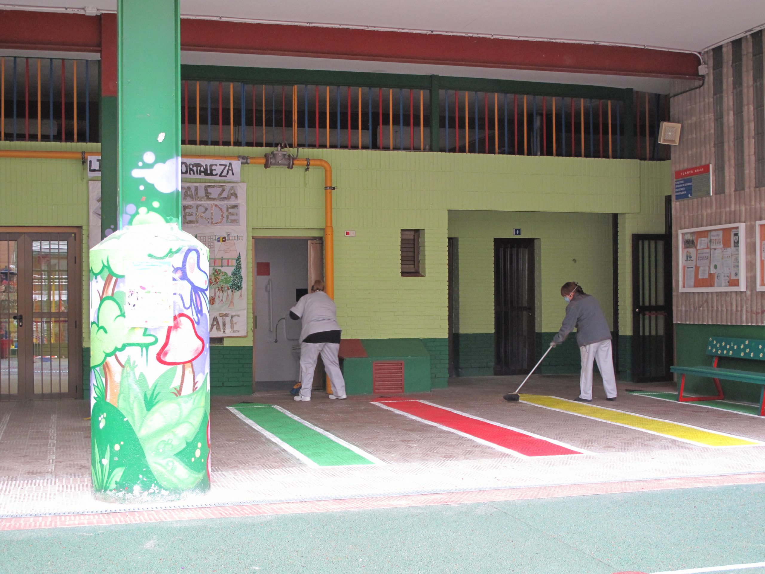 El personal de limpieza está realizando labores de desinfección en los colegios y centros municipales. Respecto al material de protección, el personal contactado manifiesta que sí se les ha suministrado y que lo están utilizando para protegerse.