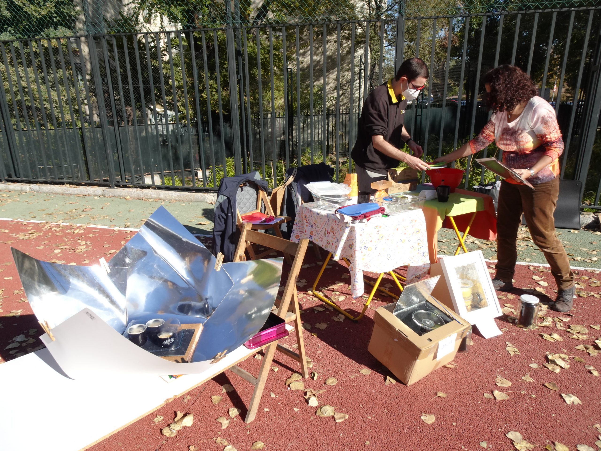 La muestra de cocinas y hornos solares corrió a cargo de Silvia, y llamó la atención de muchas personas dispuestas a poner en marcha en su terraza o en su patio estos artilugios tan sencillos de construir y tan eficientes en el uso de la energía. Con tan solo colocarlos con la orientación idónea para atrapar los rayos solares, los diveros modelos de cocinas y hornos empleados (el horno solar 30-60, llamado así porque permite situarlo en distintas posiciones; la cocina solar Copenhagen, que está formada por varias superficies reflectoras curvas; cocinas solares de cajas de cartón, y botes concéntricos) fueron capaces de cocinar flanes y cocer huevos.