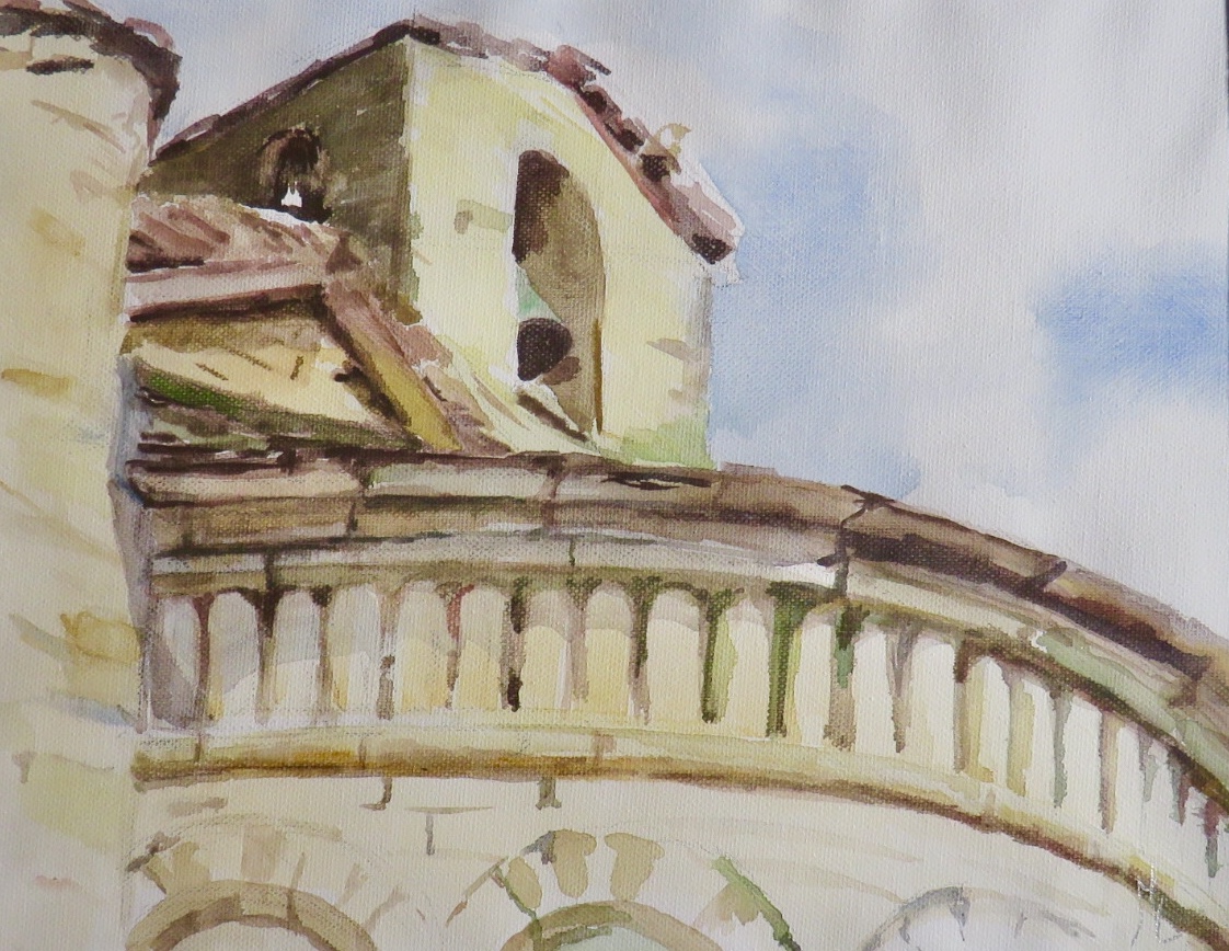 De esta acuarela destacaría la luz de un día radiante, en la que sólo se deja ver la iglesia bajo un cielo azul.