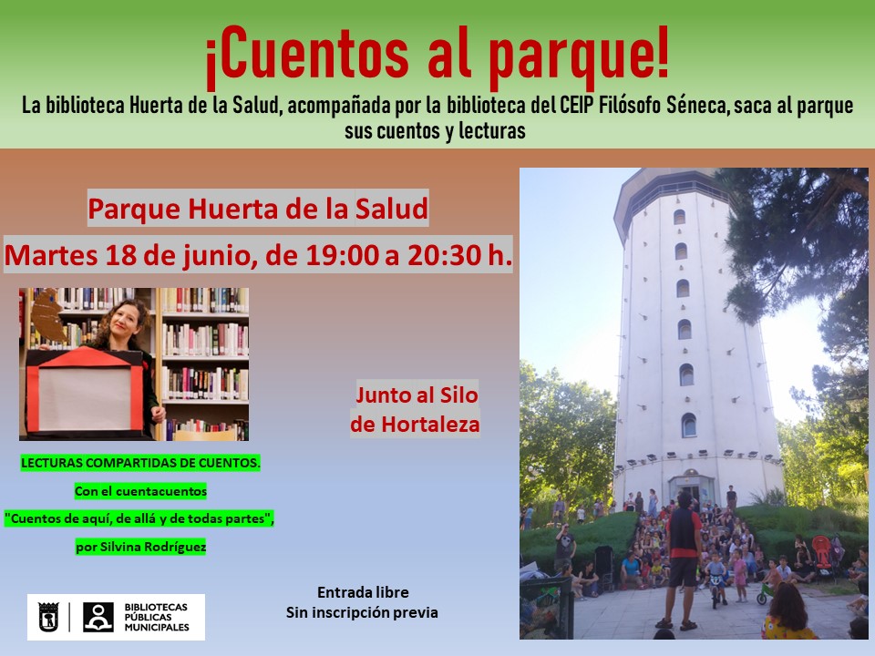 El martes 18 de junio, de 19.00 a 20.30 horas, la biblioteca Huerta de la Salud volverá a sacar, un año más, sus cuentos infantiles al parque del mismo nombre, junto al legendario Silo de Hortaleza, gracias a su clásica actividad ¡Cuentos al parque!, de tal modo que infancia, cultura, naturaleza y patrimonio del distrito seguirán dándose la mano con cariño. Los esfuerzos escolares y la mayor vida en interiores de meses atrás merecen resarcimientos.