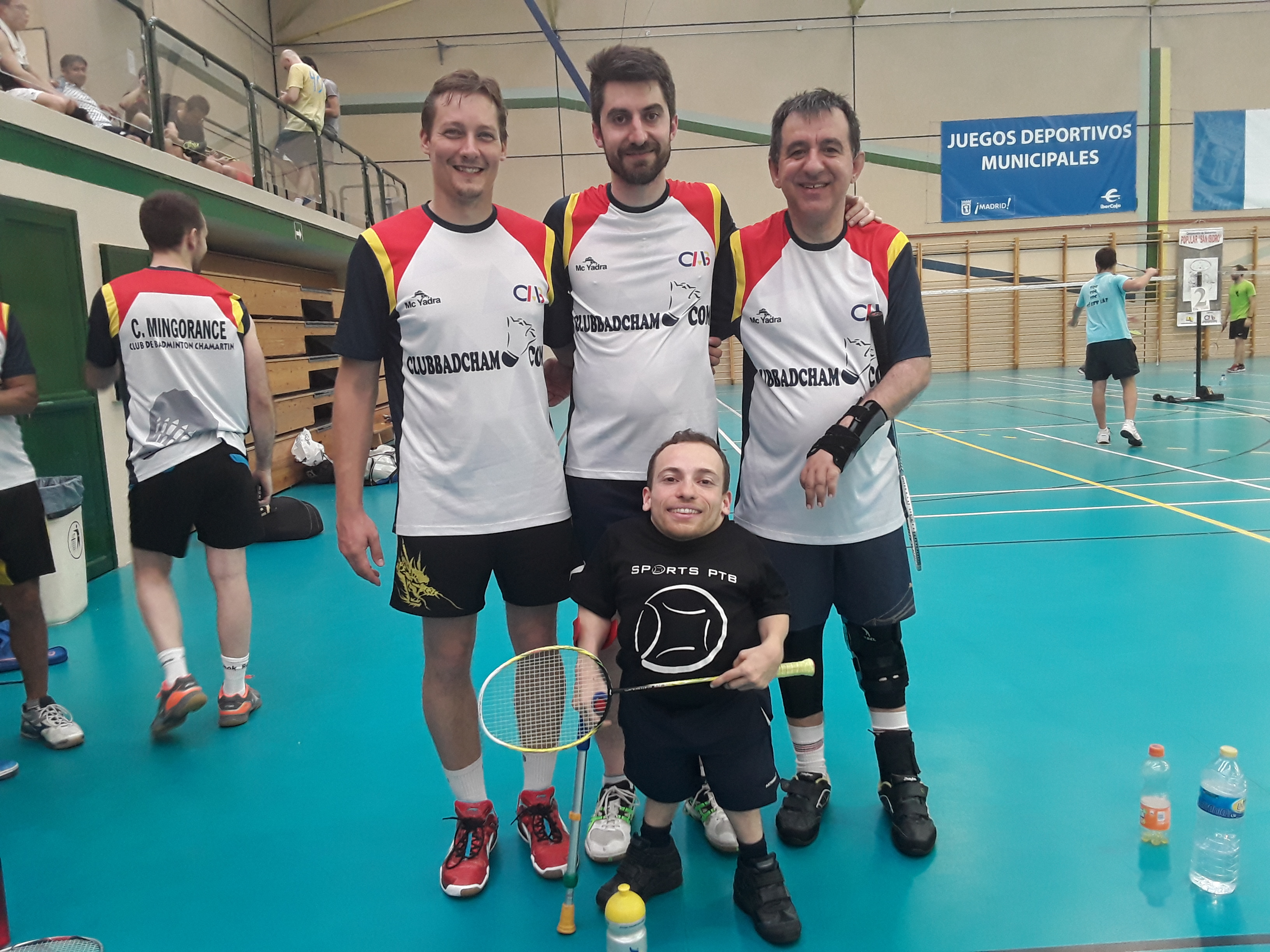 Joan Pahisa, multideportista paralímpico, con Eladio –jugador del torneo– y Eduardo Hernández y Manuel Gómez Mateo –director y entrenadores del Club de Bádminton Chamartín– / Foto Eduardo Henández