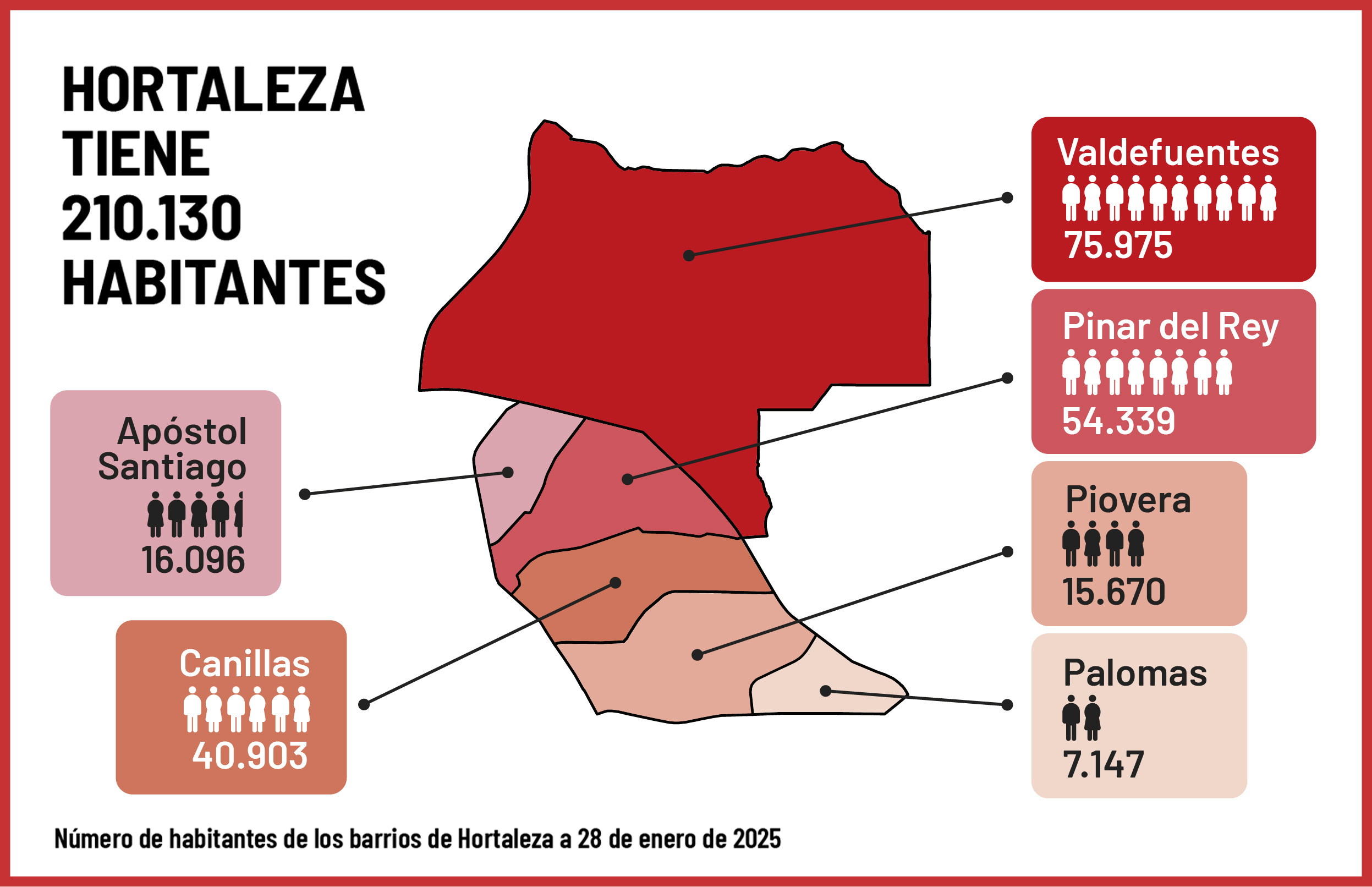 En la actualidad, según el padrón municipal actualizado a 28 de enero de 2025, el distrito de Hortaleza tiene 210.130 habitantes: Valdefuentes (75.975), Pinar del Rey (54.339), Canillas (40.903), Apóstol Santiago (16.096), Piovera (15.670) y Palomas (7.147). De esta manera, supera a ciudades madrileñas como Alcalá de Henares, Getafe o Móstoles.