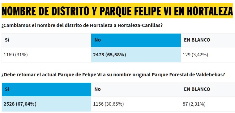 Además, la consulta permitía revocar la decisión de la exalcaldesa Ana Botella de rebautizar el parque forestal del distrito con el nombre del actual jefe del Estado. “¿Retiramos el nombre de Felipe VI del parque forestal de Valdebebas?”, se formulaba en las papeletas.
