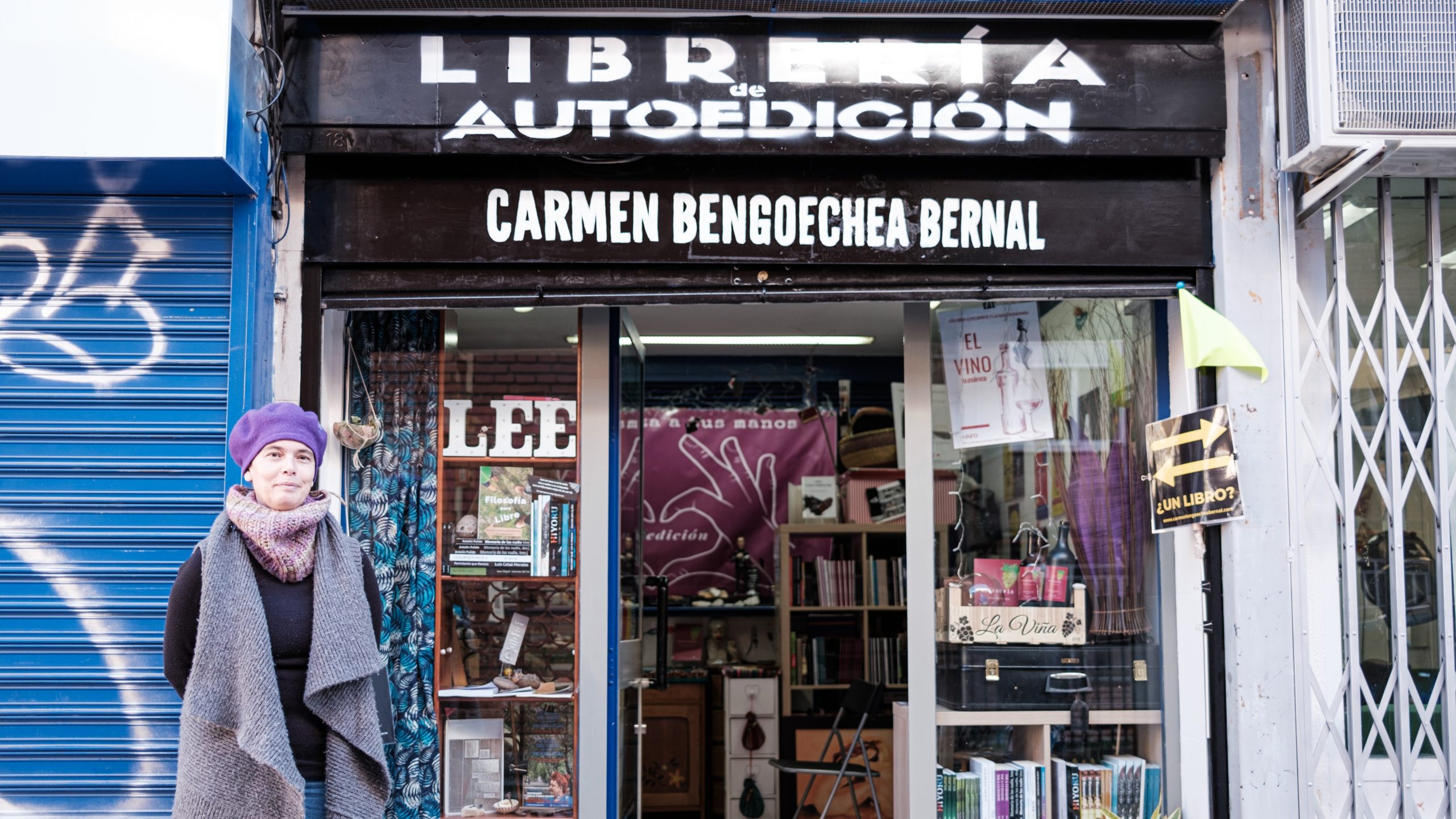 Carmen Bengoechea, delante de la entrada de la Librería de Autoedición que abrió en 2022 en la calle Balaguer. JAVIER PORTILLO