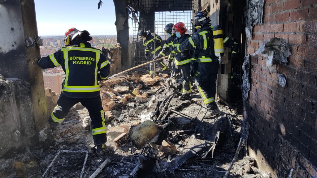 En las labores de extinción, los bomberos han empleado grúas de 70 metros, las más altas de las que disponen, para sofocar las llamas en los últimas plantas de la torre, impidiendo que se propagaran por los pisos inferiores. El fuego ha afectado a las tres plantas superiores y el ático del edificio, según ha explicado Emergencias Madrid.