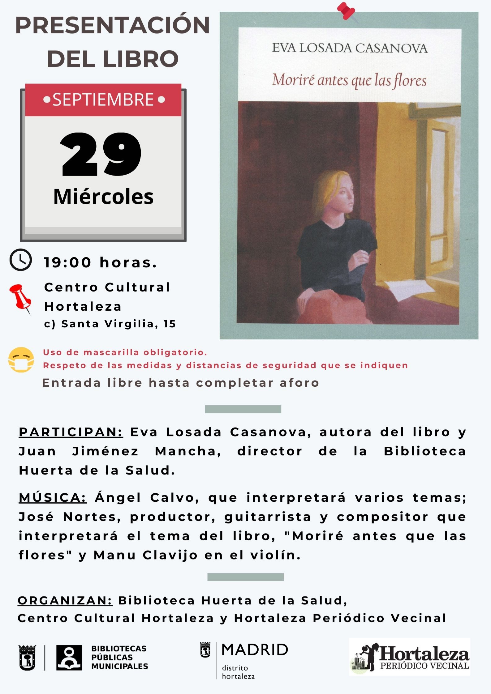 El miércoles 29 de septiembre a las 19.00 horas en el centro cultural Hortaleza (calle de Santa Virgilia, número 15), se presentará el libro Moriré antes que las flores, la última novela de la escritora, vecina del distrito, Eva Losada Casanova.