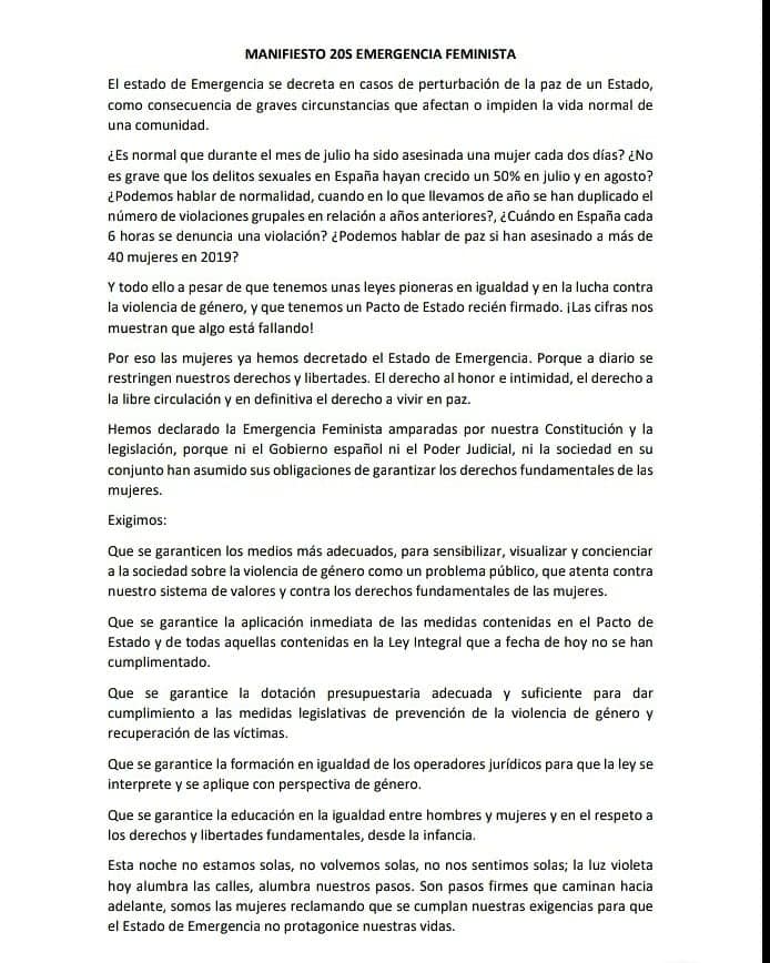 Debido al aumento de las víctimas de violencia de género y de delitos sexuales en los últimos meses, el viernes 20 de septiembre, la Comisión 8M Hortaleza organiza una concentración nocturna bajo el nombre Noche Violeta, convocada por diversos puntos de la ciudad de Madrid, junto con un manifiesto.