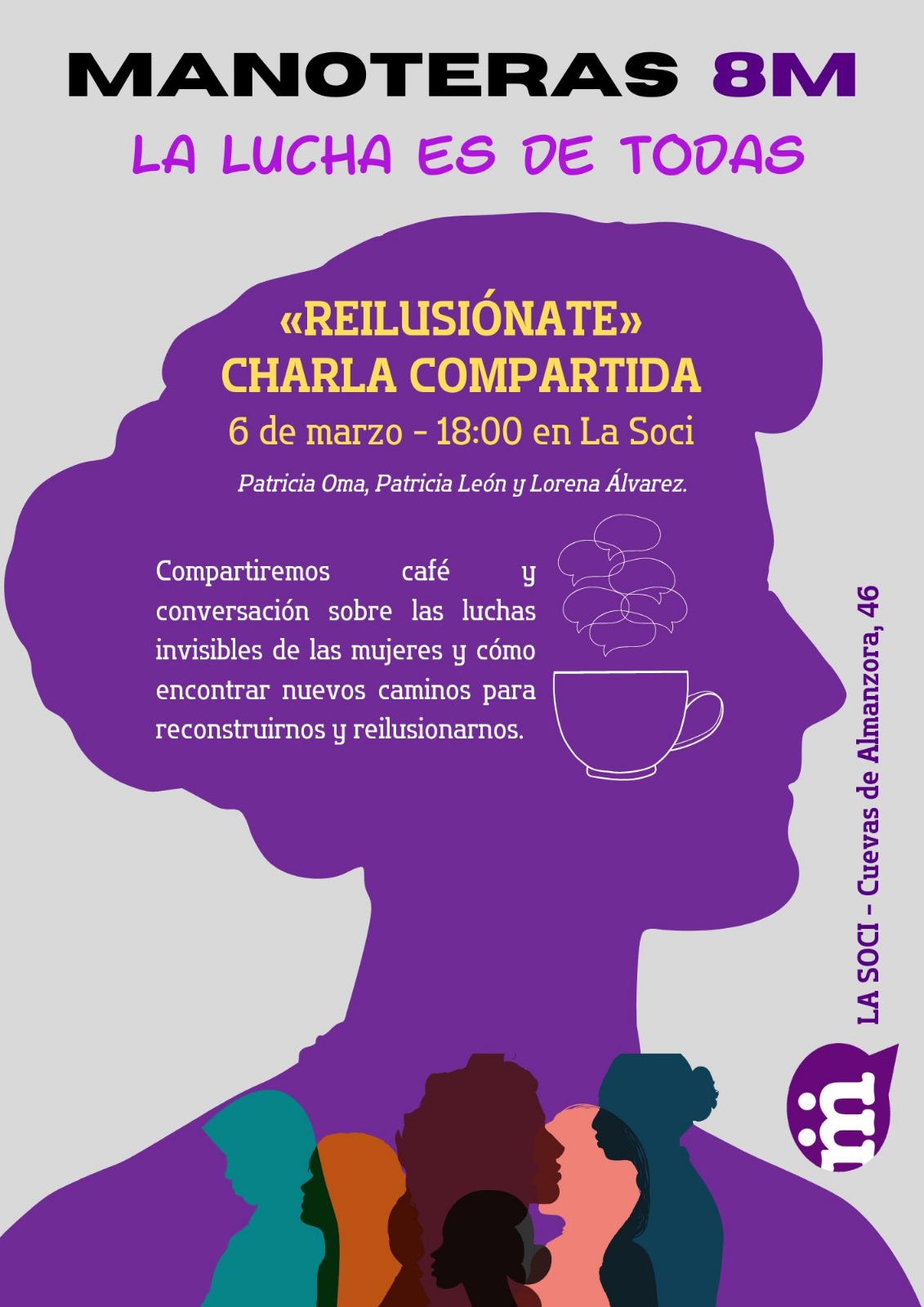 Continúan las actividades que ha organizado la Soci de Manoteras (Cuevas de Almanzora, 46) para celebrar el 8M, Día Internacional de la Mujer. El miércoles 6 de marzo a las 18.00 horas, se organiza la charla «Reilusiónate».