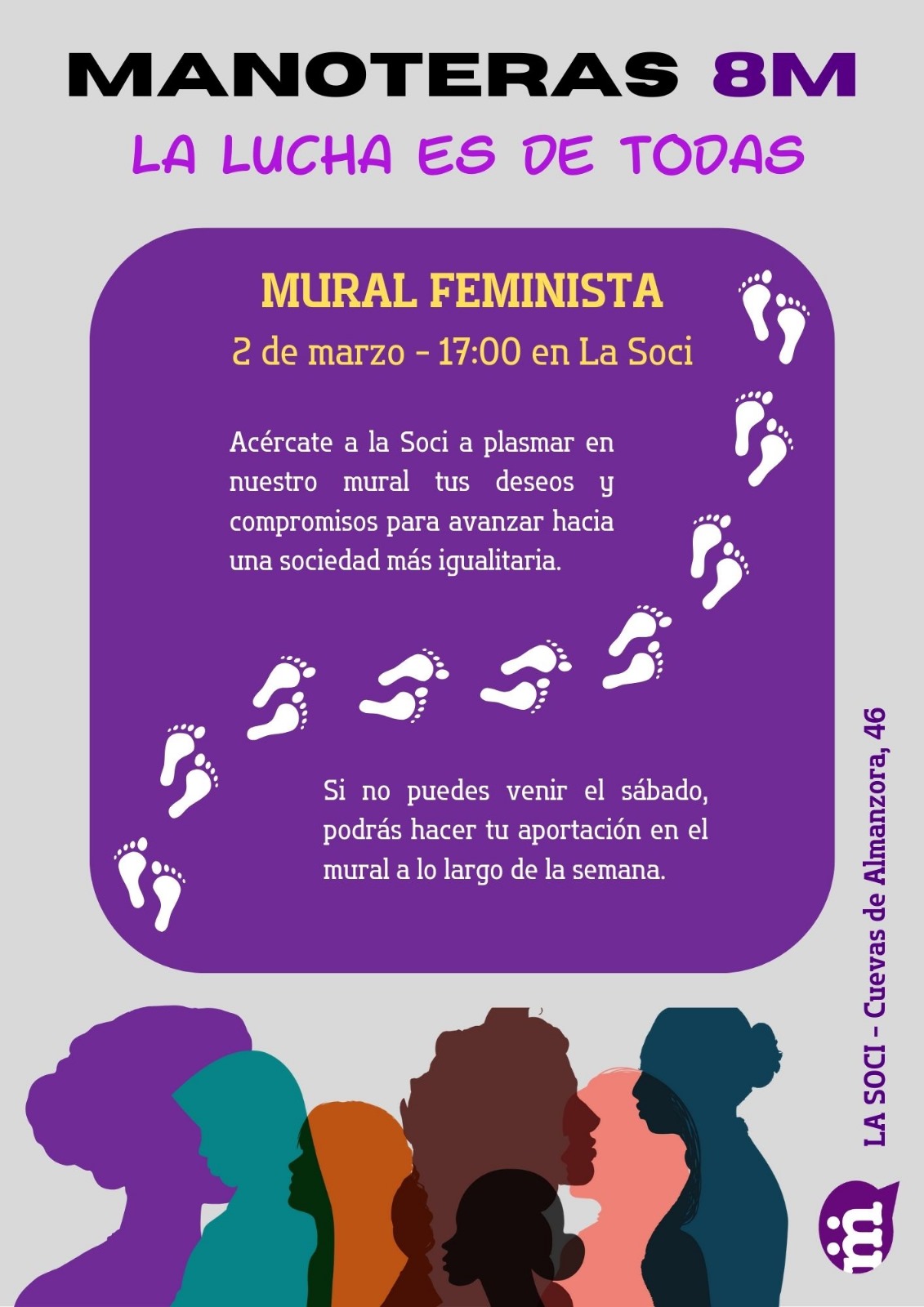 Continúan las actividades que ha organizado la Soci de Manoteras (Cuevas de Almanzora, 46) para celebrar el 8M, Día Internacional de la Mujer. El sábado 2 de marzo a las 17.00 horas, invitan al vecindario a participar en la construcción de un mural feminista en su sede donde aportar un mensaje para recorrer el camino hacia la igualdad.