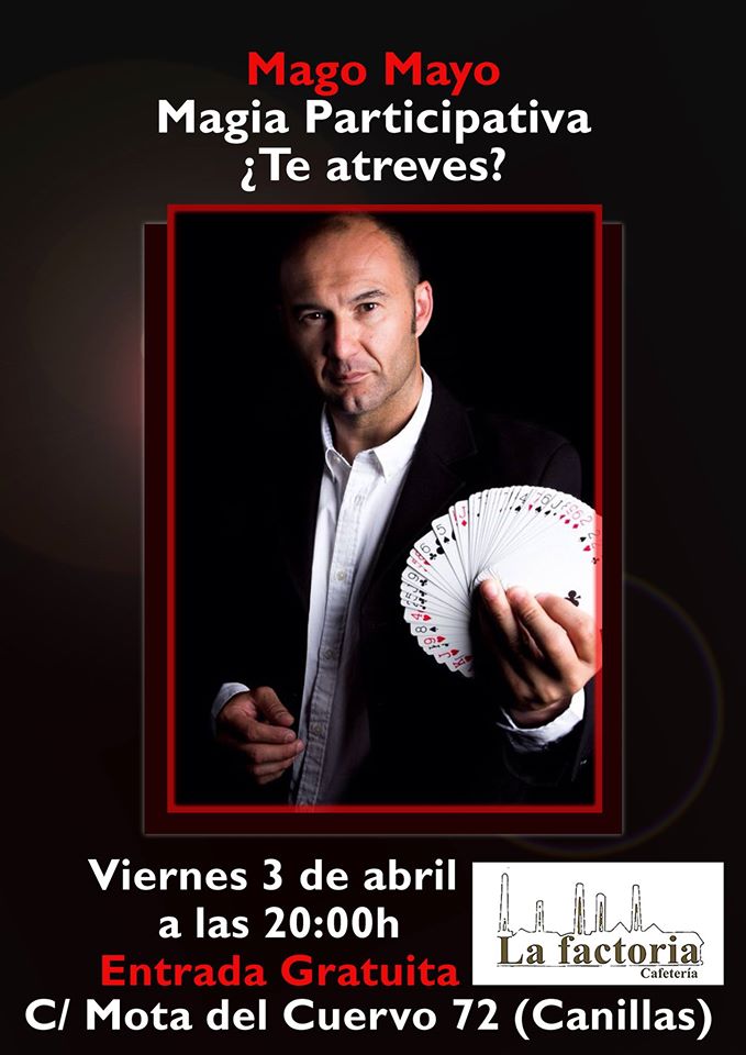 Este viernes 3 de abril, el Mago Mayo actúa en la cafetería La Factoría de Canillas, en la calle Mota del Cuervo número 72, donde ofrecerá a partir de las 20 horas su espectáculo de magia participativa. La asistencia es libre y gratuita.