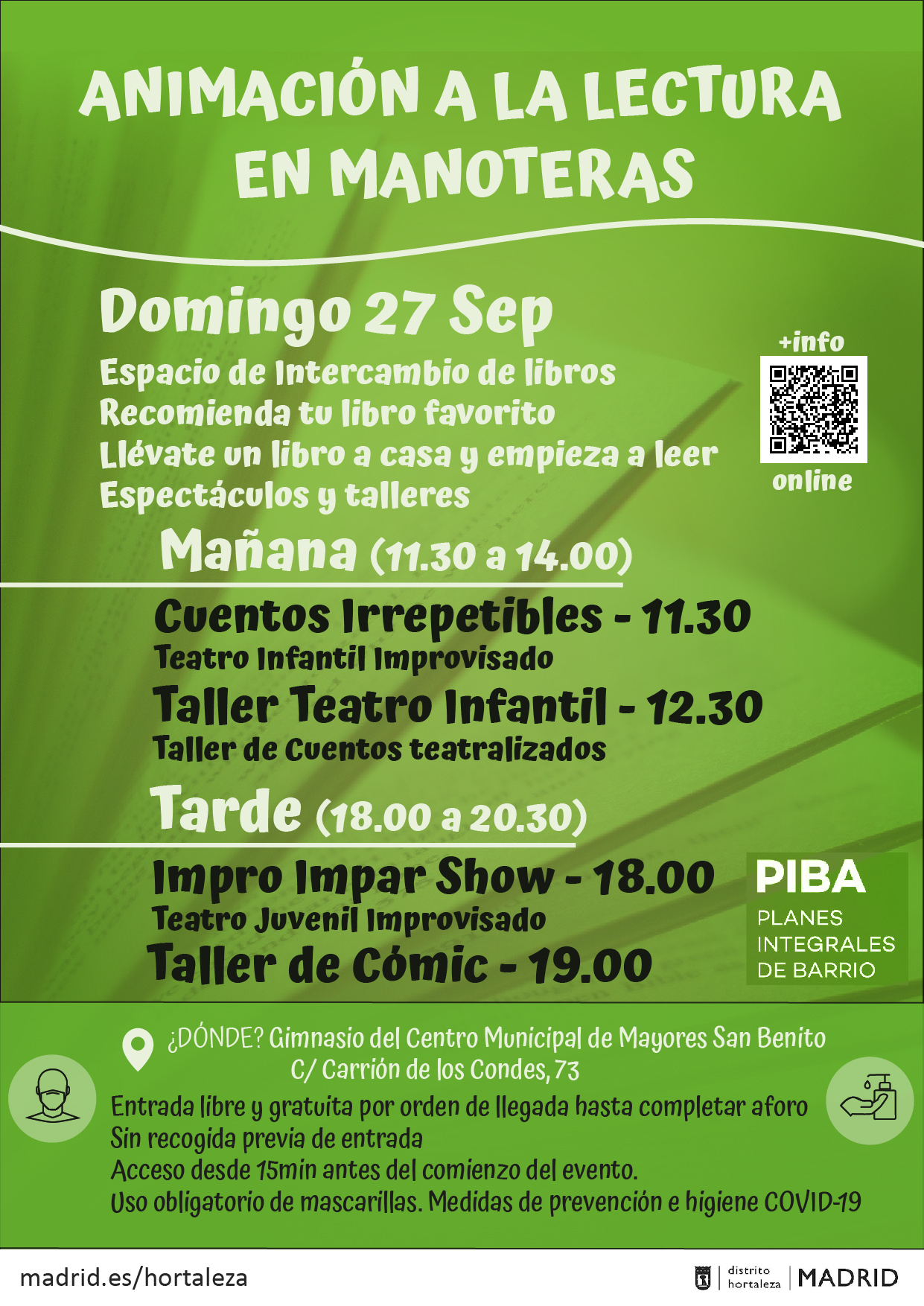 El domingo 27 de septiembre, la asociación cultural Las Cosas Que Hacemos ha organizado una jornada llena de actividades para fomentar la lectura entres los niños, niñas y jóvenes del barrio de Manoteras en el gimnasio del centro municipal de mayores San Benito (Carrión de los Condes, 73).