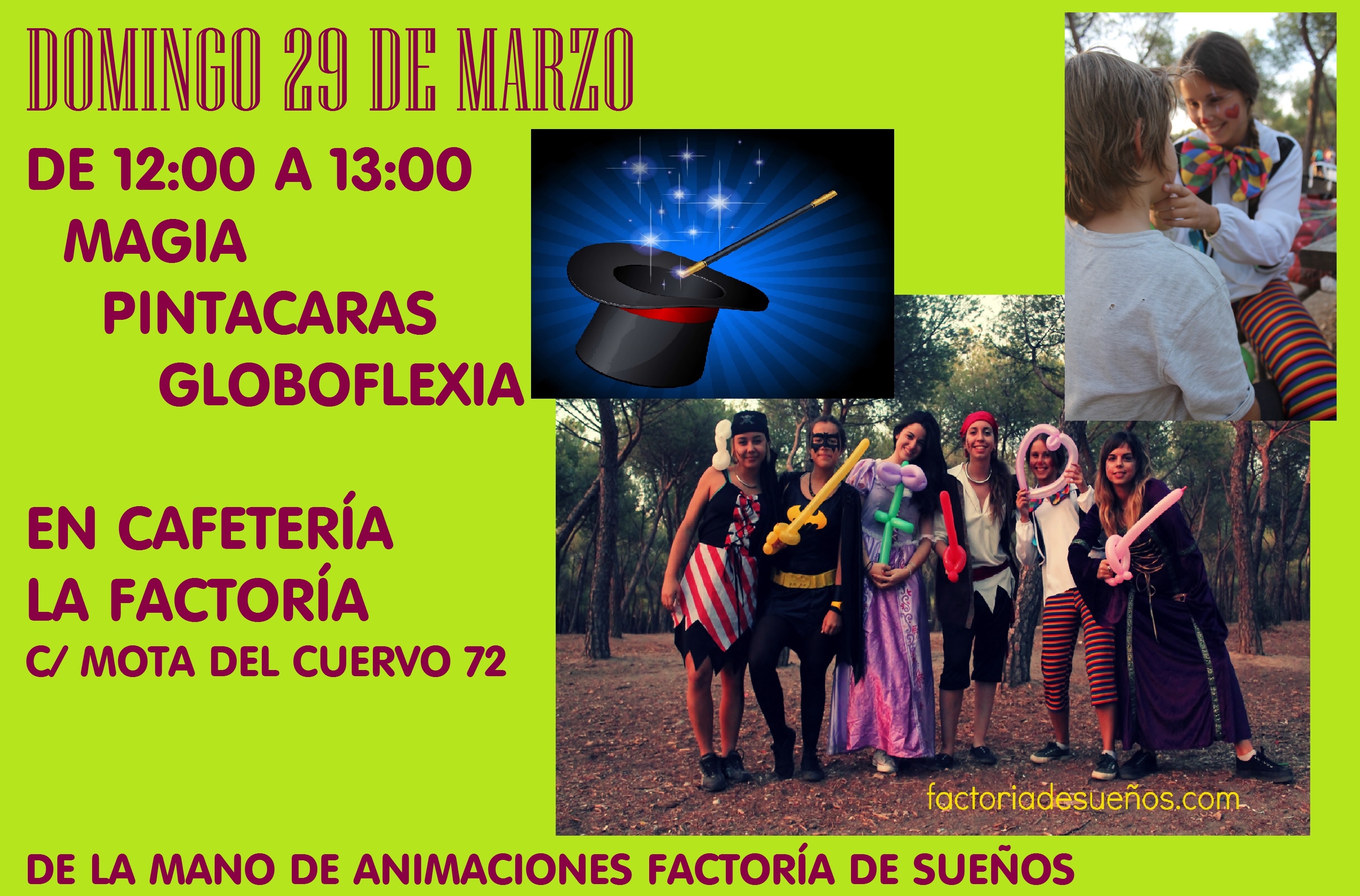 GratuitoEste domingo 29 de marzo, la cafetería La Factoría de Canillas (calle Mota del Cuervo número 72) organiza a las 12 horas actividades infantiles como pintacaras, globofexia y magia para los más pequeños.