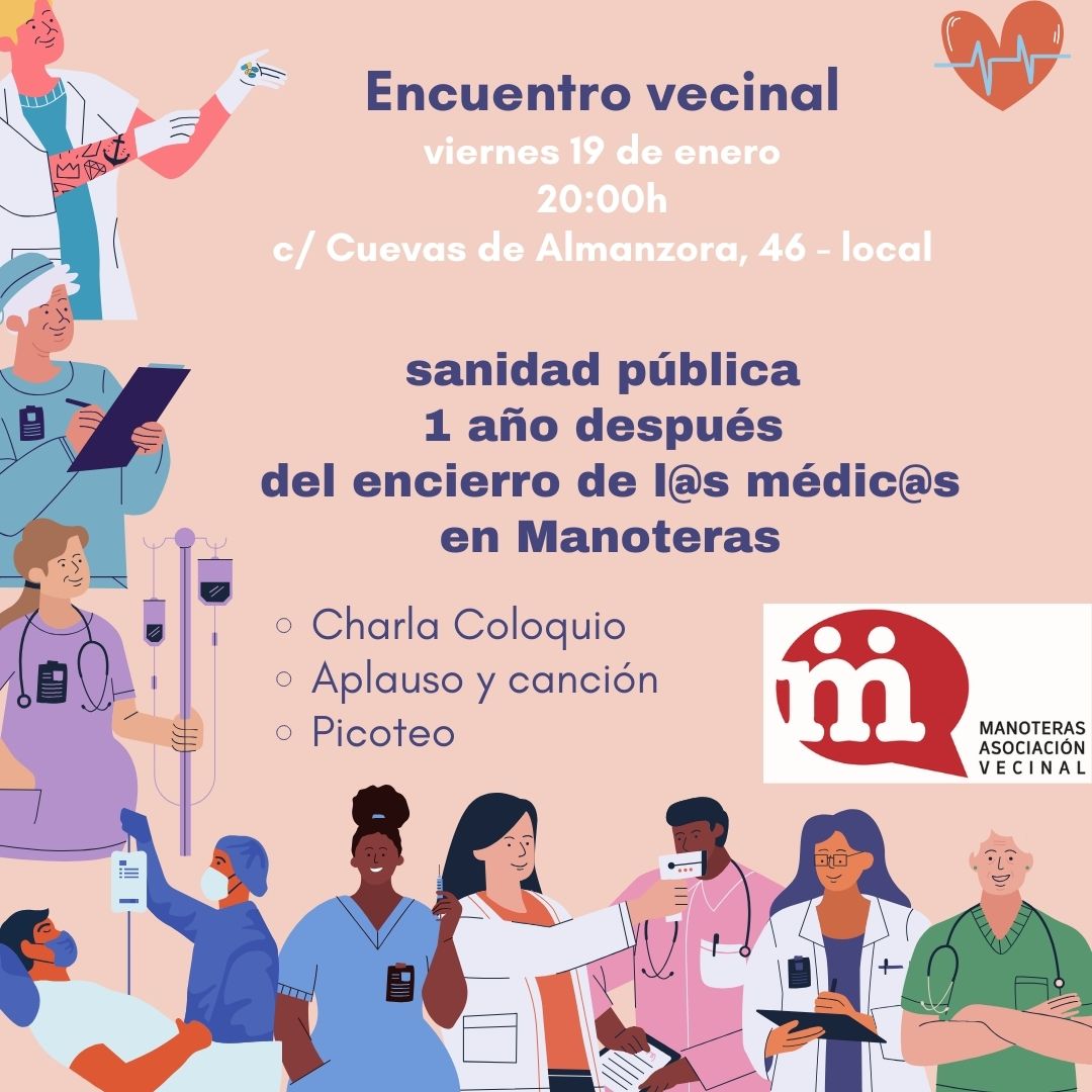 Por esta razón, este viernes 19 de enero a las 20.00 horas, para celebrar el primer aniversario del encierro de médicos en Manoteras, se invita al vecindario a participar en un encuentro vecinal en la Soci de Manoteras (calle Cuevas de Almanzora, 46) para hacer balance de la evolución de la sanidad pública en este tiempo e identificar las reivindicaciones que siguen adelante.