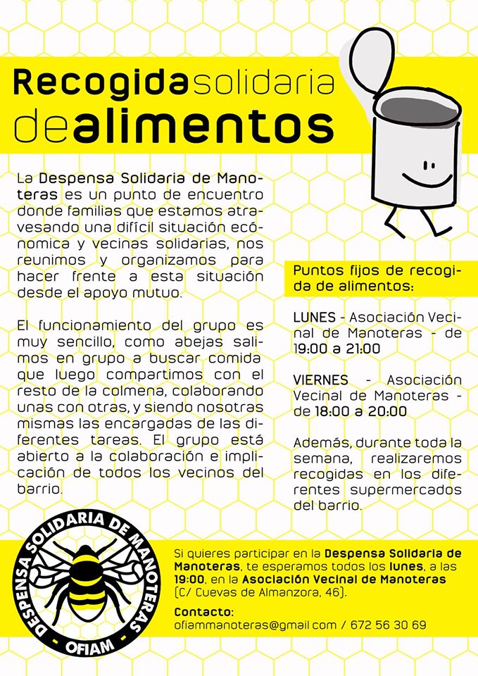 De este modo, la despensa recogerá alimentos en la asociación vecinal de Manoteras (calle Cuevas de Almanzora 46) los lunes de 19 a 21 horas y los viernes de 18 a 20 horas. Además, se invita al vecindario a participar en la despensa los lunes a las 19 horas, y también se realizarán recogidas de alimentos por los supermercados del barrio.