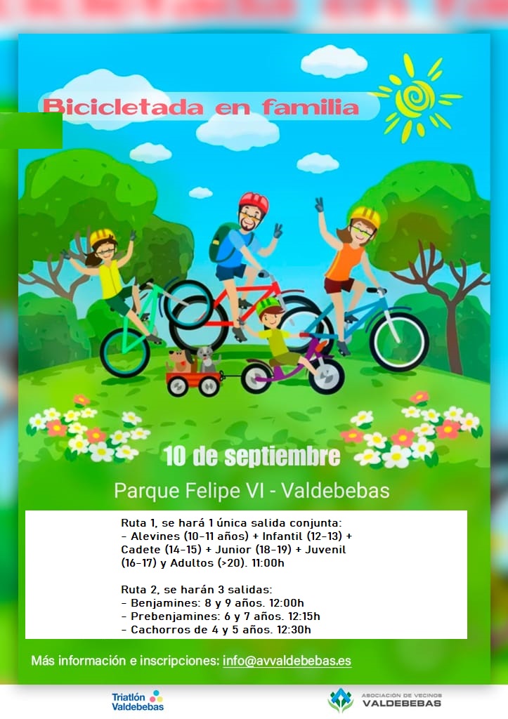 La asociación vecinal Valdebebas y el club Triatlón Valdebebas organizan la mañana del sábado 10 de septiembre una bicicletada en familia en el parque forestal de Valdebebas (avenida de las Fuerzas Armadas, 11).