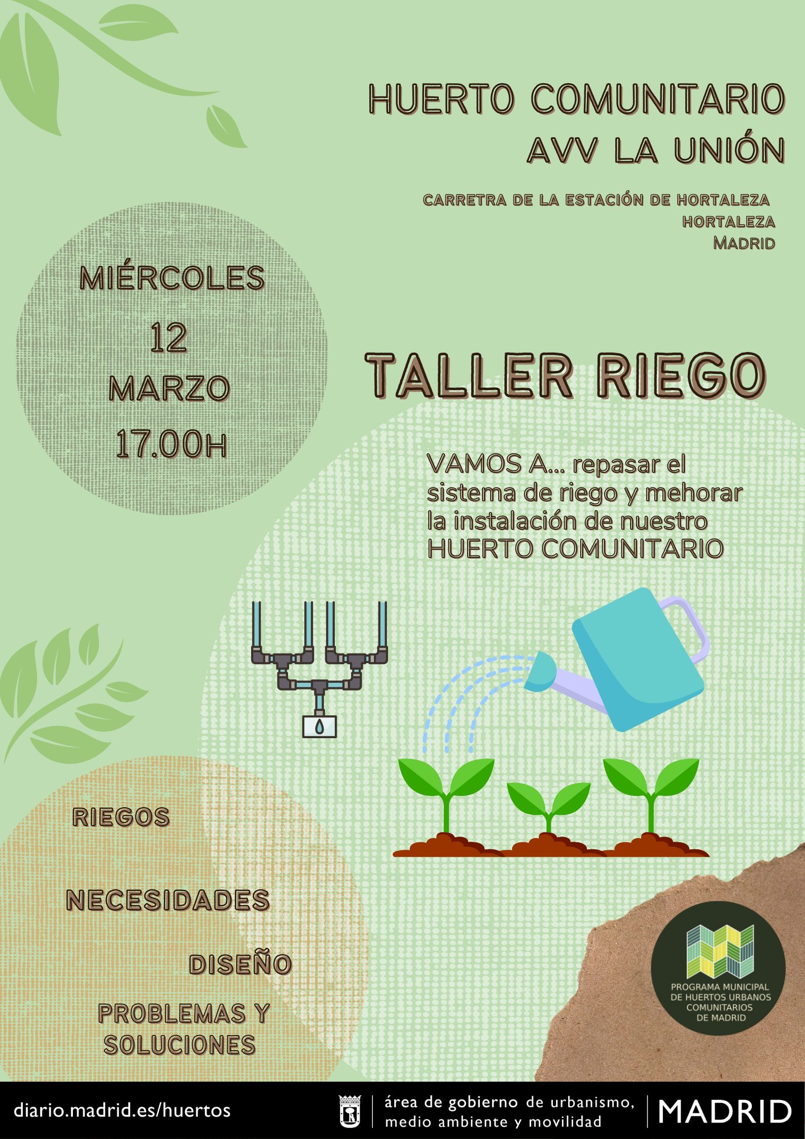 El miércoles 12 de marzo a las 17.00 horas, se celebra un nuevo taller del huerto comunitario AV La Unión de Hortaleza en el parque Doña Guiomar (Carretera de la Estación de Hortaleza), dentro de la Red de Huertos Urbanos de Madrid, dedicado al riego impartido desde El Bancal Agroecología (cooperativa medioambiental).
