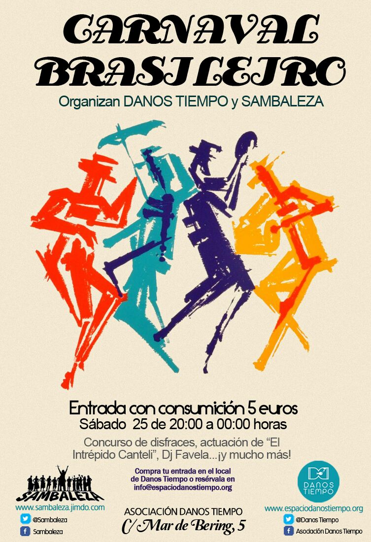 5€¡Los Carnavales llegan al barrio! Sambaleza y Danos Tiempo se unen para celebrar esta fiesta pagana de creatividad, samba y disfraces. El sábado 25 de febrero, a partir de las 20 horas en el local de Danos Tiempo (Mar de Bering, 5), podrá disfrutarse de: