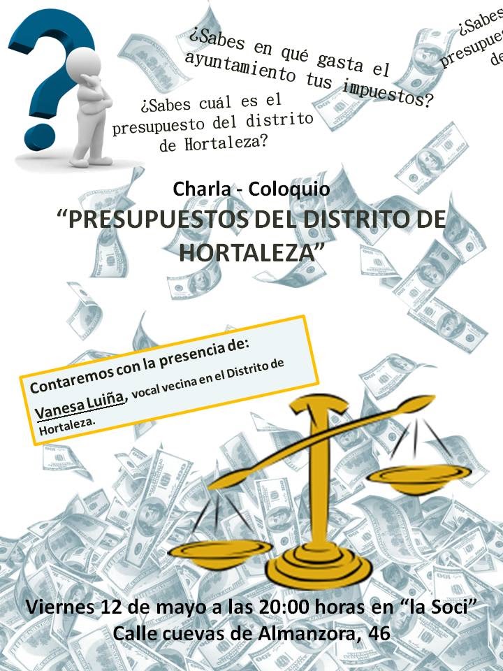 La vocal vecina Vanesa Luiña participa este viernes 12 de mayo en el local de la Asociación Vecinal Manoteras (Cuevas de Almanzora 46) en la presentación de los presupuestos del distrito. Se trata del encuentro previsto de Vanesa y de Carlos Sánchez Mato que tuvo que ser aplazado y al que, nuevamente, el concejal de Economía de la Villa no podrá asistir.