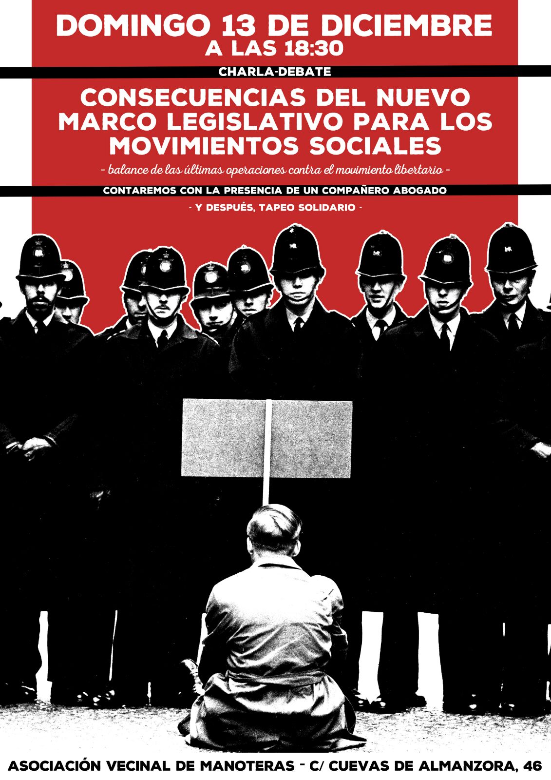 La asociación vecinal de Manoteras acoge el domingo 13 de diciembre, a las 18:30 horas, una charla sobre las consecuencias del nuevo marco legislativo para los movimientos sociales en su local de la calle Cuevas de Almanzora.