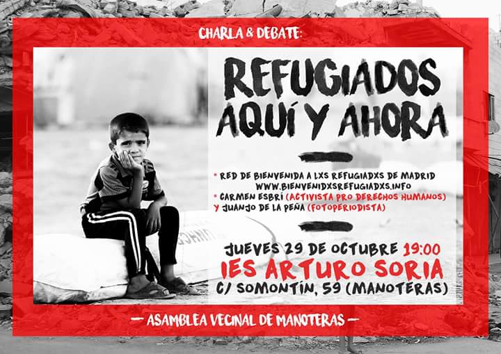 El jueves 29 de octubre, a las 19 horas en el salón de actos del IES Arturo Soria (C/ Somontín, 59 Metro Manoteras), la asociación vecinal de Manoteras organiza la charla-debate ‘Refugiados, aquí y ahora‘.
