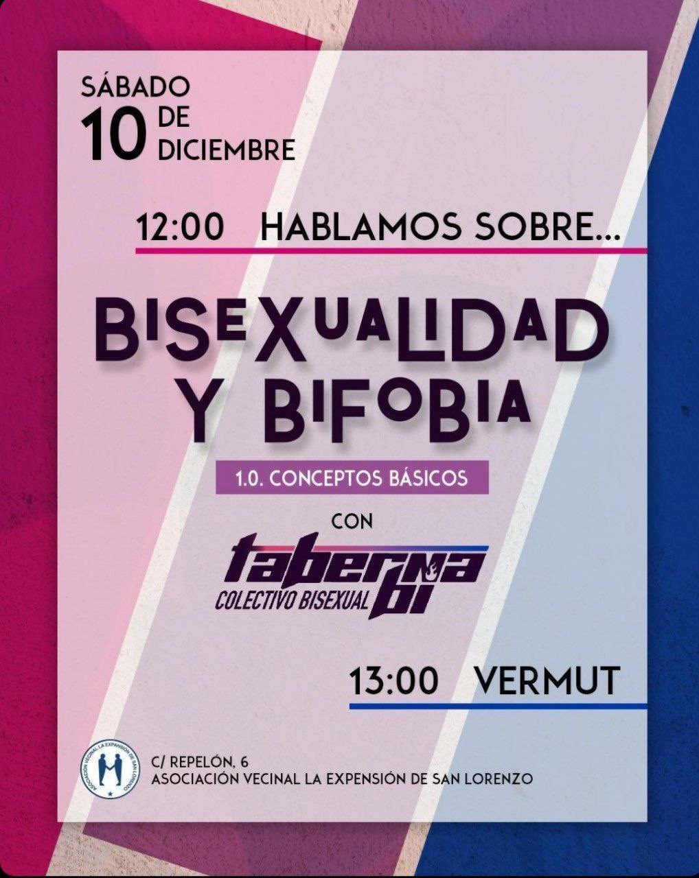 El sábado 10 de diciembre, la asociación de vecinos La Expansión de San Lorenzo organiza a las 12.00 horas en su sede de la calle Repelón, número 6, una charla sobre bisexualidad y bifobia a cargo del colectivo Taberna Bi.