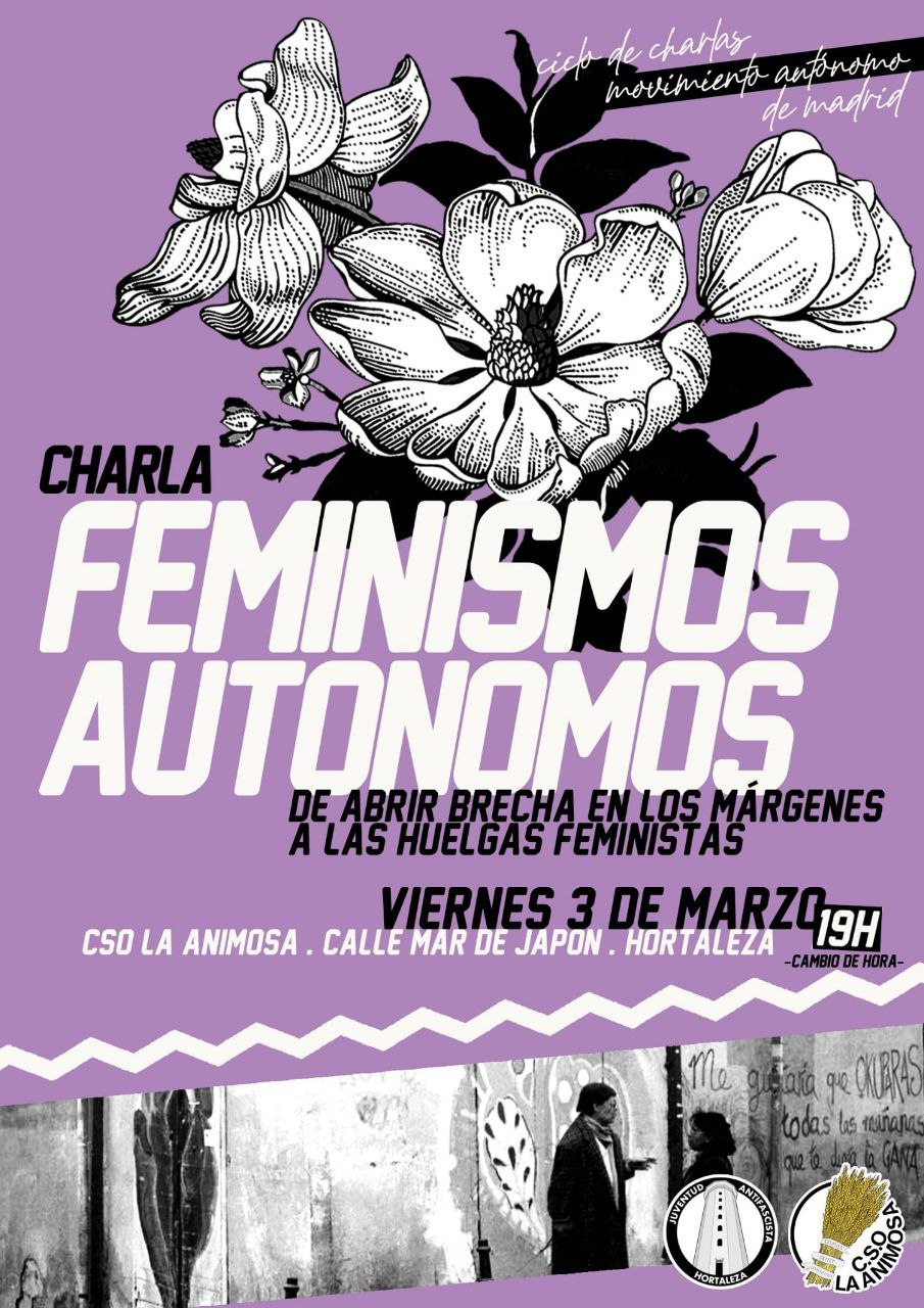Por tercer año consecutivo, el colectivo Juventud Antifascista de Hortaleza celebra las Jornadas Feministas de Hortaleza en el centro social okupado La Animosa (calle Mar del Japón, 15), empezando el viernes 3 de marzo a las 19.00 horas con la charla sobre feminismos autónomos.
