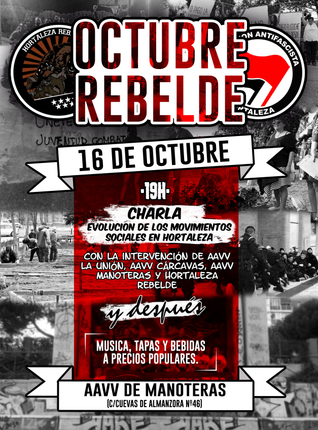 El colectivo Hortaleza Rebelde celebra su aniversario con varias actividades bajo el nombre ‘Octubre Rebelde’. La primera de ellas será una charla sobre la evolución de los movimientos sociales en Hortaleza, y se celebrará este viernes 16 de octubre en la asociación vecinal de Manoteras (C/ Cuevas de Almanzora, 46 Metro Manoteras) a las 19 horas.