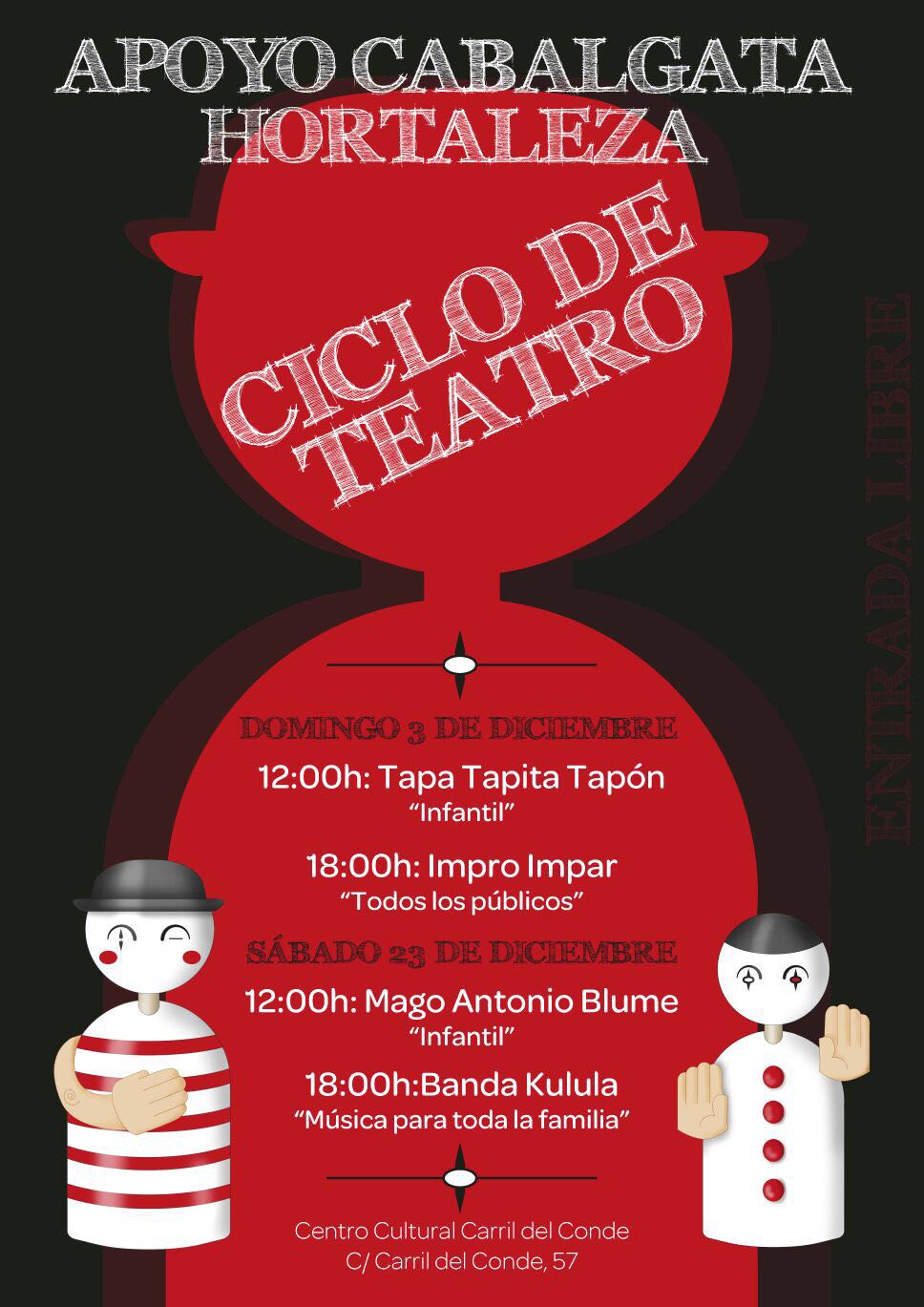 El domingo 23 de diciembre, se celebra el ciclo de teatro Apoyo a la Cabalgata de Hortaleza en el centro cultural Carril del Conde (Carril del Conde, 57), con dos grandes espectáculos: a las 12.00 horas, el Mago Antonio Blume actuará para los más pequeños y, a las 18.00 horas, la Banda Kulula, música para toda la familia.