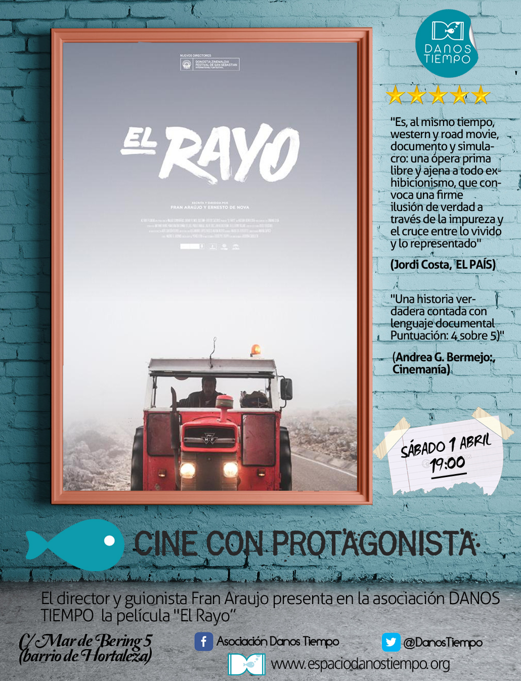 GratuitoNueva edición de ‘Cine con protagonista’, actividad organizada por la asociación Danos Tiempo en la que en esta ocasión se presentará el documental El Rayo, y que contará con la presencia de su director Fran Araujo para el coloquio posterior. La cita es el sábado 1 de abril a las 19 horas en el local de la calle Mar de Bering, 5, con entrada gratuita.