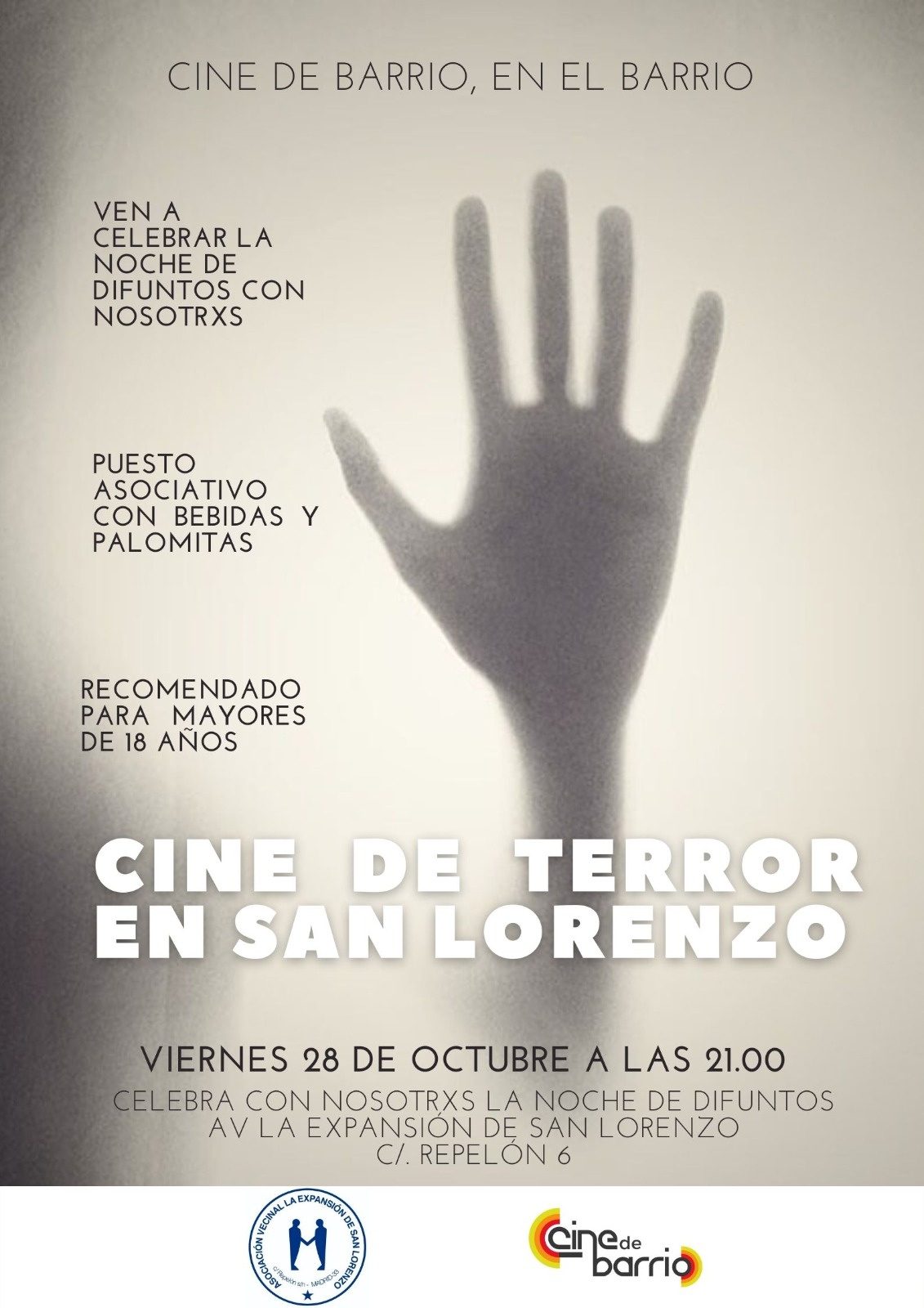 - Etiquetas del Evento:Asociación de Vecinos La Expansión de San Lorenzo, Cine de Barrio en Hortaleza, Cine de Barrio en San Lorenzo, Película de terror en San Lorenzo, Puesto asociativo