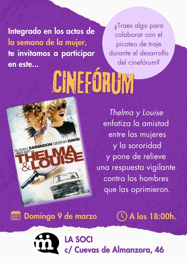 El domingo 9 de marzo a las 18.00 horas, con motivo de la celebración del 8M, Día Internacional de la Mujer, se invita al vecindario a participar en un cinefórum en torno a la proyección de Thelma & Louise en la Soci de Manoteras (calle Cuevas de Almanzora, 46).
