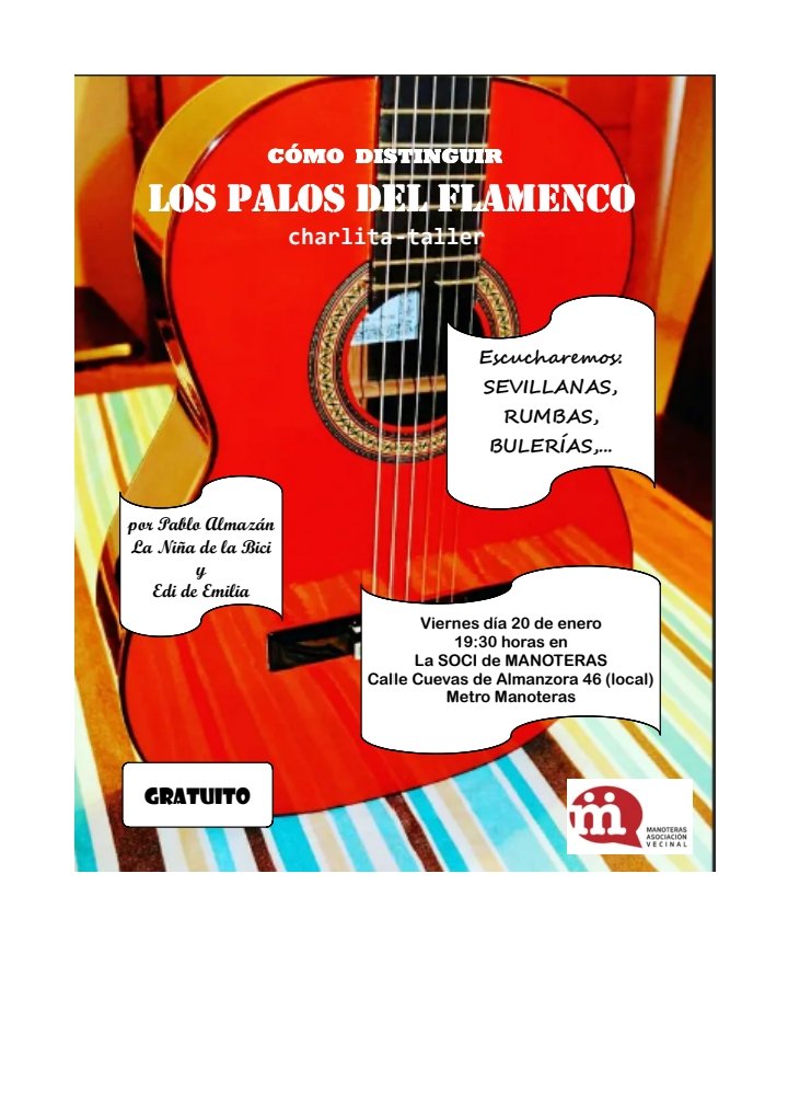 Este viernes 20 de enero de 19.30 a 21.00 horas, la Soci de Manoteras (calle Cuevas de Almanzora, 46) acoge la interesante charla taller «Cómo distinguir los palos del flamenco» impartida por el profesor Pablo Almazán, quien durante más de dos décadas se ha dedicado a la enseñanza de la música en el instituto público Conde de Orgaz.