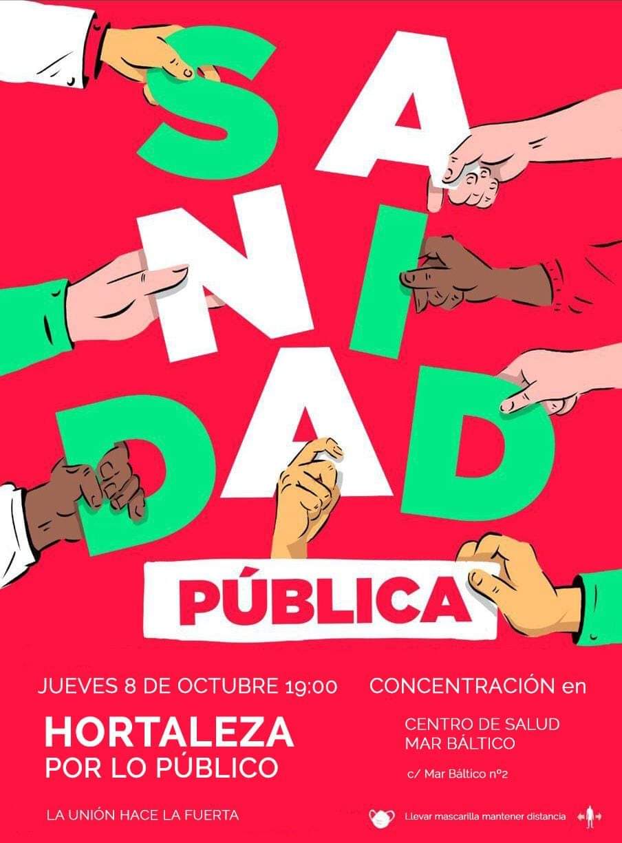 Este jueves 8 de octubre a las 19.00 horas, se celebran nuevas concentraciones en defensa de una sanidad pública, universal y de calidad en numerosos centros de salud de Madrid. En Hortaleza, se realizará frente al centro de salud Mar Báltico (Mar Báltico, 2).