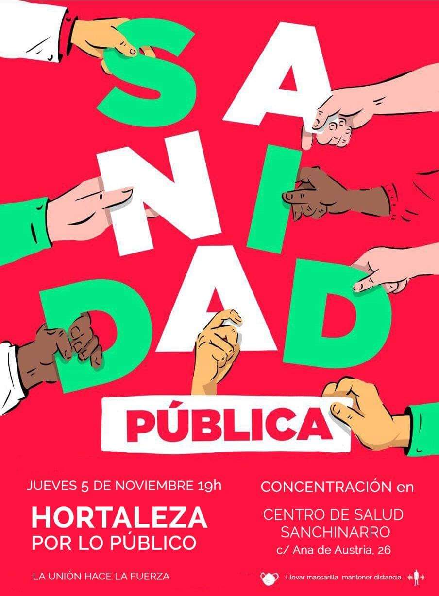 Este jueves 5 de noviembre a las 19.00 horas, se celebran nuevas concentraciones en defensa de una sanidad pública, universal y de calidad en numerosos centros de salud de Madrid. En Hortaleza, se realizará frente al centro de salud Sanchinarro (Ana de Austria, 26).