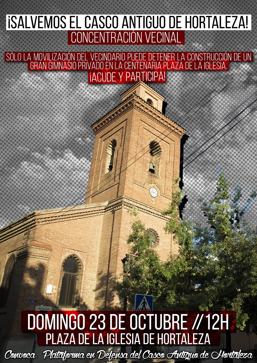 La Plataforma en Defensa del Casco Antiguo de Hortaleza ha convocado una concentración vecinal el domingo 23 de octubre, a las 12 horas, en la Plaza de la Iglesia para oponerse a la construcción de un gran gimnasio privado en este rincón centenario, que supondrá el derribo de una decena de edificios, algunos con más de 150 años de antiguedad.