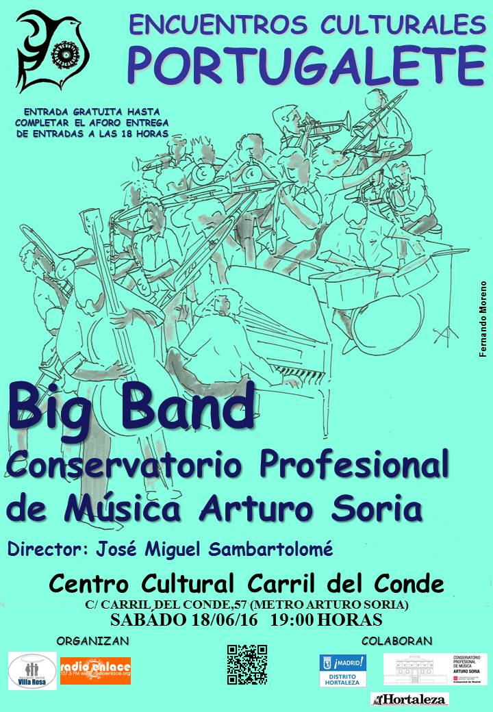 El sábado 18 de junio, nueva cita con el jazz en directo en Hortaleza. La Big Band del Conservatorio Arturo Soria actúa en el centro cultural Carril del Conde (Calle Carril del Conde, 57) gracias a los Encuentros Culturales Portugalete, la iniciativa que todos los meses programa conciertos de jazz con entrada gratuita en nuestro barrio.