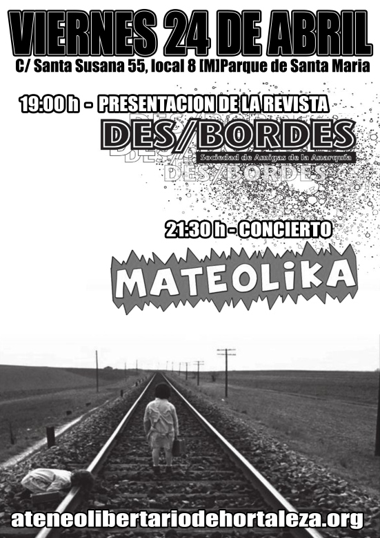 Este viernes 24 de abril, el Ateneo Libertario de Hortaleza acoge la presentación de la revista Des/Bordes, que finalizará con el concierto del grupo Meteolika. La cita es a partir de las 19 horas en la calle Santa Susana 55 posterior, y la entrada es gratuita.