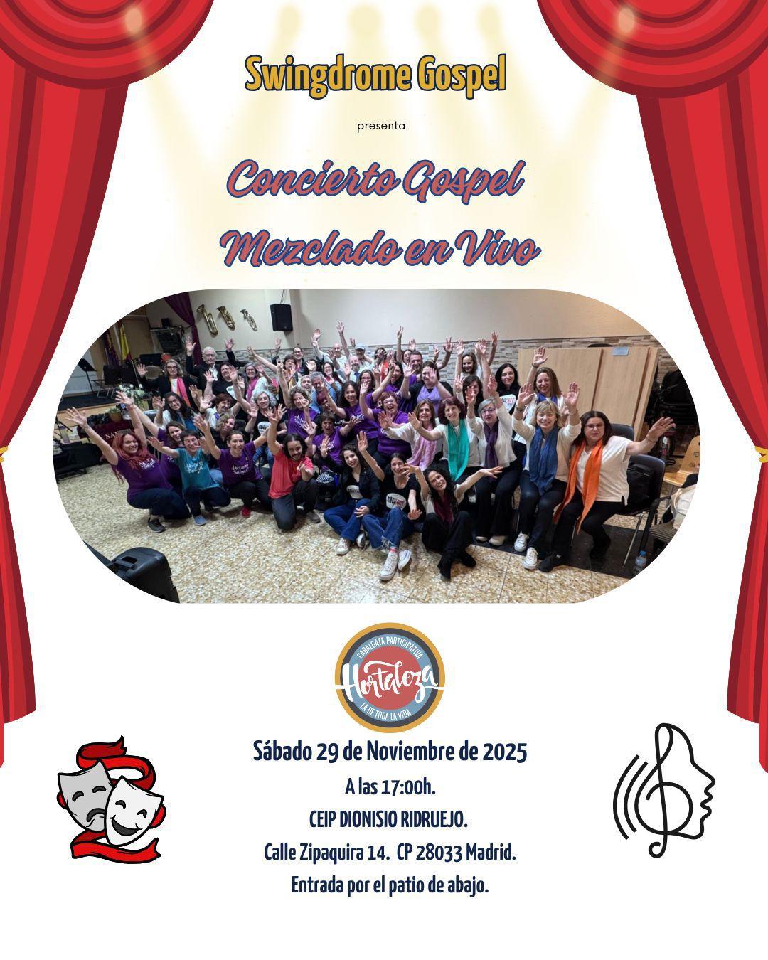 El sábado 29 de noviembre a las 17.00 horas, comienzan las actividades que se realizan en apoyo de la Cabalgata Participativa de Hortaleza, con el concierto del coro Swingdrome Gospel mezclado en vivo en el colegio Dionisio Ridruejo (calle Zipaquirá, 14).