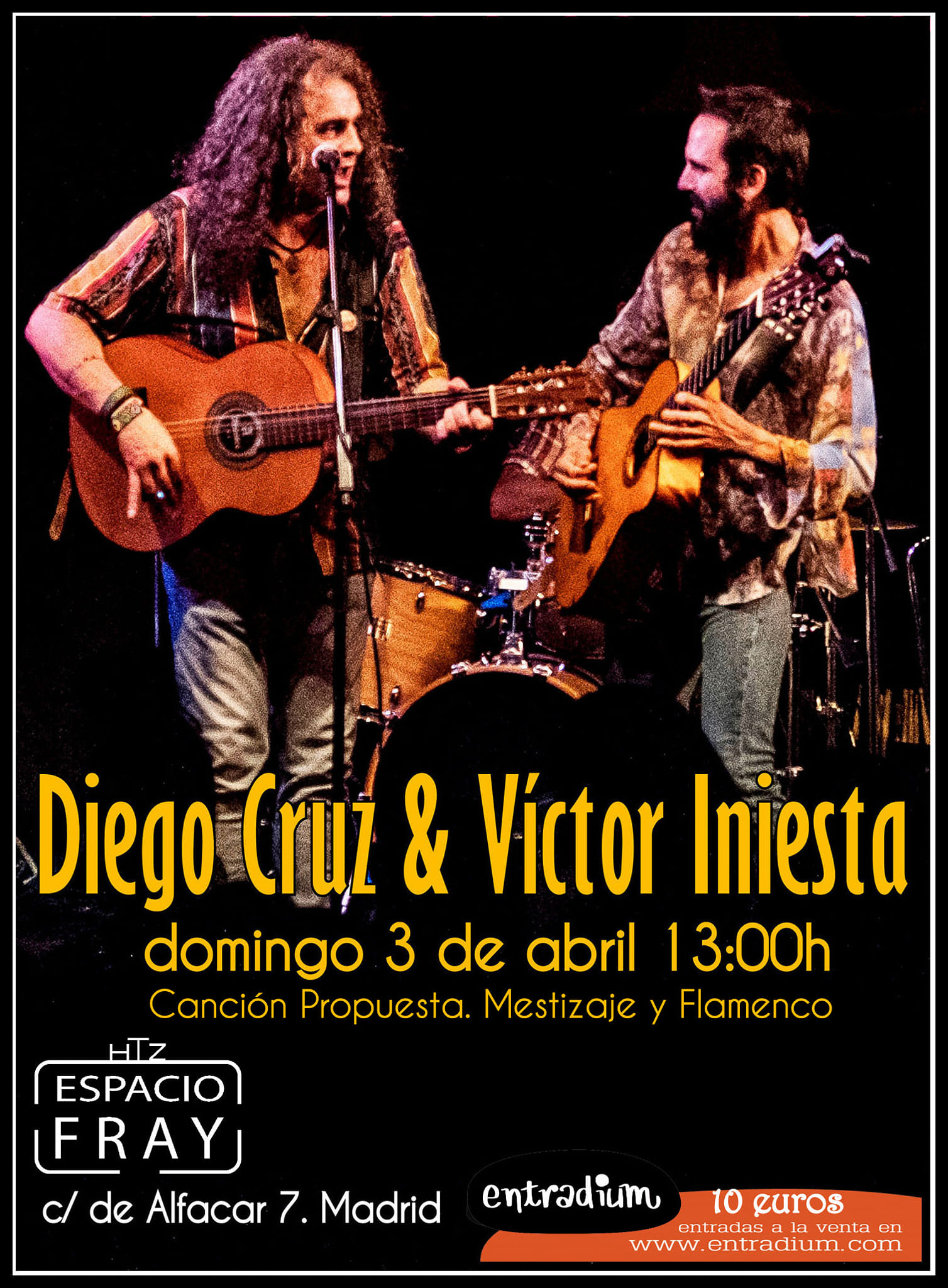 El domingo 3 de abril a las 13.00 horas, se celebra un concierto de Diego Cruz y Víctor Iniesta en horario vermú en el Espacio Fray (calle Alfacar, 7).