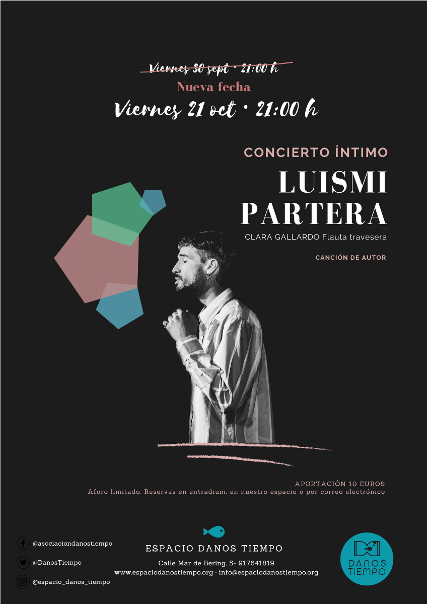 El viernes 21 de octubre, vuelven a celebrarse de nuevo los conciertos íntimos en el local del Espacio Danos Tiempo (calle Mar de Bering, 5). En esta ocasión, a partir de las 21.00 horas, podrá disfrutarse de la música en directo del músico gaditano Luismi Partera, afincado en Madrid.