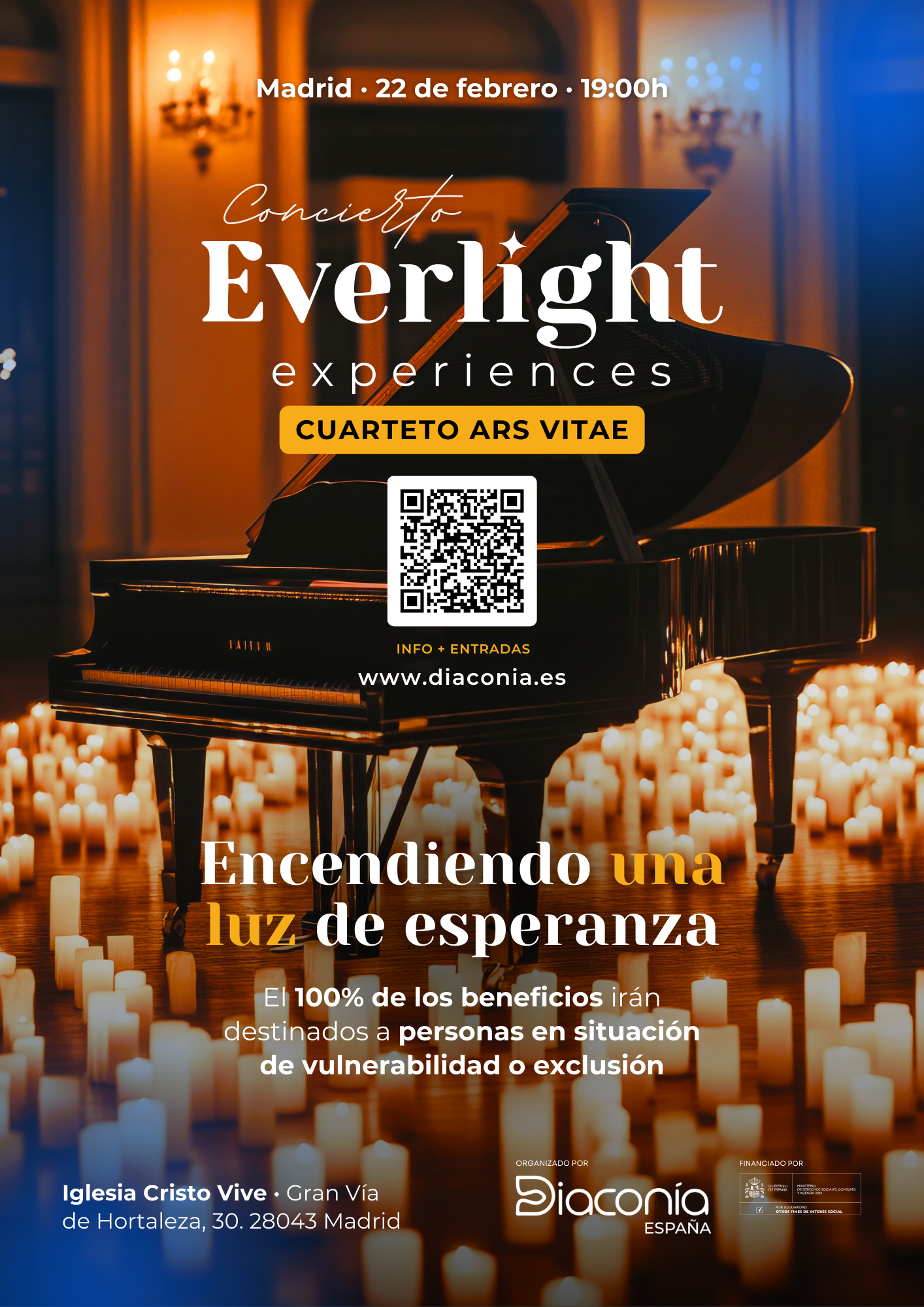 El sábado 22 de febrero, a las 19.00 horas, se celebra el concierto solidario Everlight Experiences en la iglesia evangélica Cristo Vive (Gran vía de Hortaleza, 30)