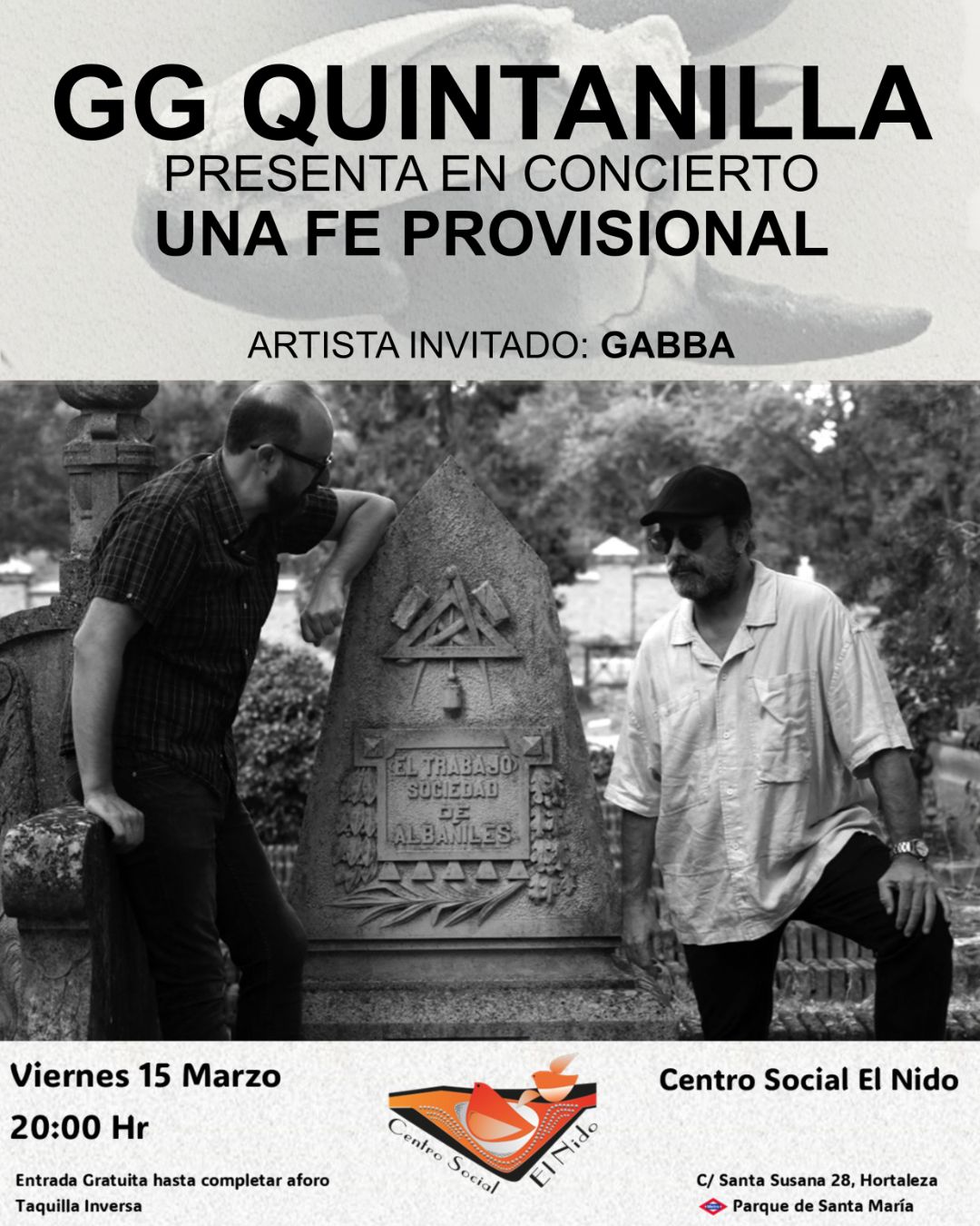 El viernes 15 de marzo, a las 20.00 horas, el roquero GG Quintanilla presenta en concierto su nuevo disco, Una fe provisional, en el centro social El Nido (calle Santa Susana, número 28 bajo), acompañado del artista invitado GABBA.