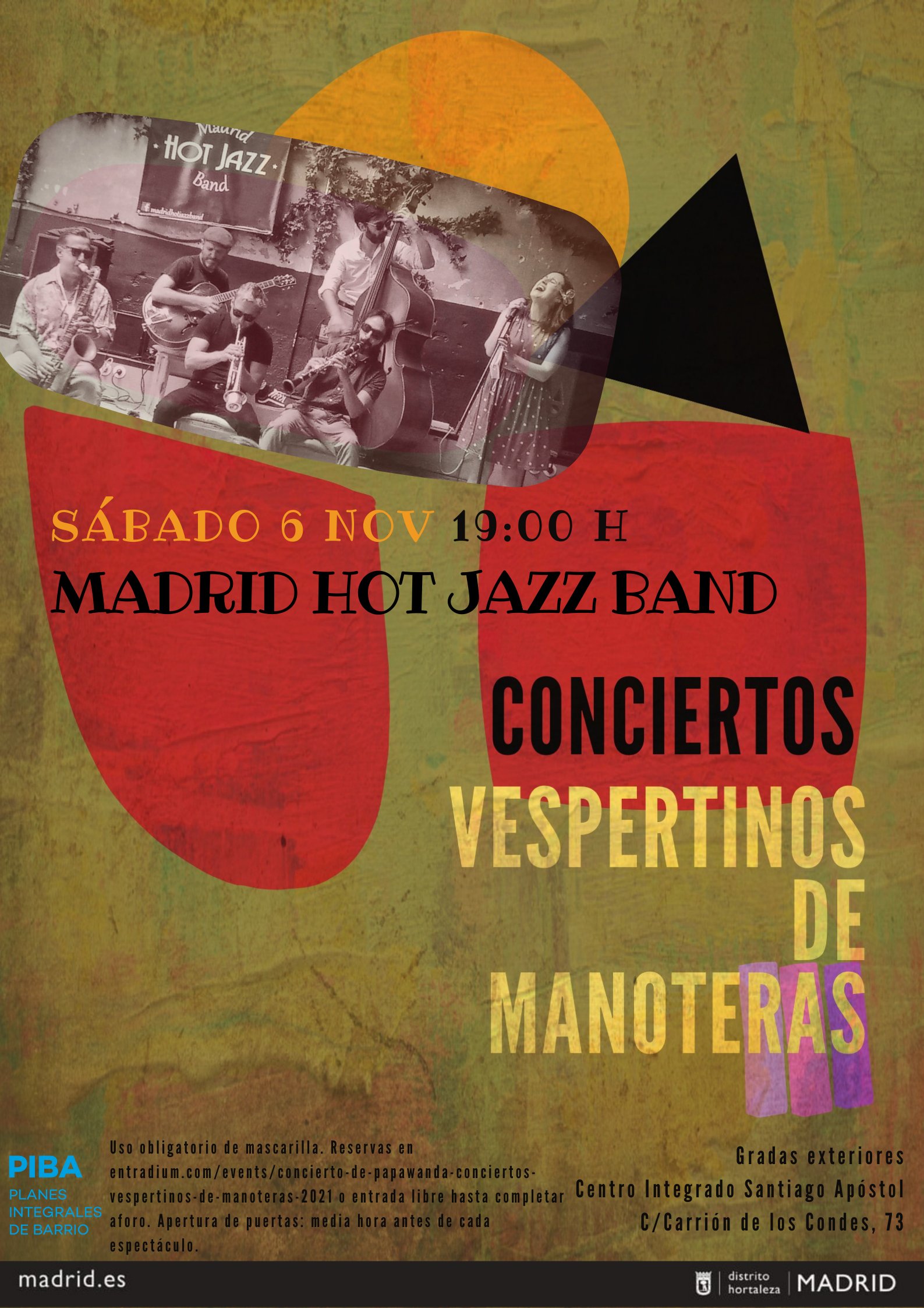- Etiquetas del Evento:Asociación Vecinal Manoteras, Centro Integrado Santiago Apóstol, Conciertos vespertinos de Manoteras, Madrid Hot Jazz Band, PIBA de Manoteras 2021, Planes Integrales de Barrio 2021