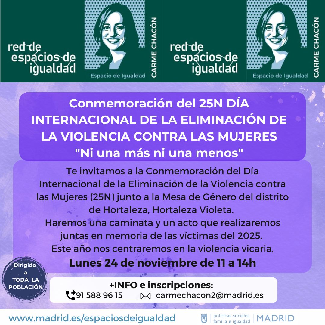 El lunes 24 de noviembre desde las 11.00 horas hasta las 14.00 horas, el Espacio de Igualdad Carme Chacón y Hortaleza Violeta invitan al vecindario a participar en la conmemoración del 25N, el Día Internacional de la Eliminación de la Violencia contra la Mujer, para recordar, visibilizar y denunciar todas las formas de violencia contra las mujeres.