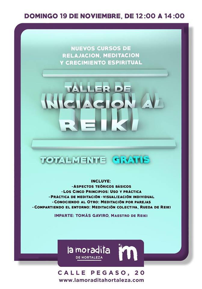 • Iniciación al Reiki: durante una hora y media aprenderemos técnicas básicas de relajación y cómo aplicarlas a nuestra vida para ser más felices.El taller está orientado a un grupo de no más de 15 personas, en el que las explicaciones teóricas ocuparán el menor tiempo posible para pasar a las cuestiones prácticas.